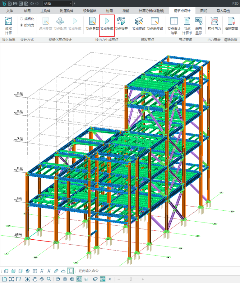 目录 搜索 展开 更新说明20251230版本更新说明更新概要1.协同模块更新点1.1通用机制1.2识图表收资⭐1.2.1操作流程介绍1.2.2功能特点1.3数据收资1.4接口1.4.1工艺协同类软件接口1.4.2计算类软件接口2.上部建模模块更新点2.1通用建模2.1.1工作树⭐2.1.2布置修改2.1.3高分屏适配⭐2.1.4楼板优化2.2快速建模⭐2.2.2快速布置水平撑2.2.1快速悬臂构件2.2.3快速洞边梁2.3智能建模2.3.1设备支架自动布梁2.4附属建模2.4.1直梯栏杆适配参数库模式2.4.2栏杆打断交互⭐3.计算模块更新点3.1荷载导荷3.2振动计算⭐3.3工况优化4.出图模块更新点4.1优化功能4.2新增海外出图模式5.基础模块更新点5.1基础模块更新点⭐5.2设备基础模块更新点5.2.1支持SH/T 3030-2025 石油化工塔型设备基础设计规范⭐5.2.2球形储罐设备及设备基础建模5.2.3支持卧式三支墩建模及计算5.2.4其他更新点1.总体介绍1.1基本功能介绍1.1.1 协同1.1.2 建模1.1.3 计算1.1.4 节点设计1.1.5 出图1.1.6 算量1.2软件界面1.2.1 菜单栏1.2.2 图形空间1.2.3 项目树1.2.4 快捷命令2.轴网2.1导入模型2.1.1导入PMCAD2.1.2增量导入PMcad2.2轴网标高2.2.1轴网标高2.2.2轴网编辑2.2.3标高编辑2.3工作面2.3.1创建工作面2.3.2工作面管理器2.3.3退出工作面2.3.4工作面的快捷按钮2.4修改工具2.4.1移动2.4.2复制2.4.3旋转2.4.4镜像2.4.5阵列2.4.6删除2.4.7拉伸2.4.8延伸2.4.9起坡2.5测量工具2.5.1测量长度2.5.2测量角度2.5.3测量面积2.5.4测量标高2.5.5测量坐标3.主构件3.1上部构件3.1.1柱3.1.2梁3.1.3支撑3.1.4快速次梁3.1.5快速支撑3.1.6拾取布置3.1.7截面刷3.2楼板3.2.1混凝土板3.2.2花纹钢板3.2.3钢格栅板3.2.4压型钢板3.2.5洞口3.2.6全房间洞3.2.7楼板设置3.2.8改板方向3.3修改3.3.1偏心对齐3.3.2构件删除3.3.3标高复制3.3.4主次梁3.3.5梁合并3.3.6梁拆分3.4基础构件3.4.1桩基3.5材料定义3.5.1全局材料3.5.2材料修改3.6显示3.6.1截面显示3.6.2构件显示3.6.3构件查找3.6.43D剖切3.6.5退出剖切4.附属构件4.1楼梯栏杆4.1.1钢直梯4.1.2钢斜梯4.1.3栏杆4.2附加构件4.2.1预埋件4.2.2地脚螺栓4.2.3翻边4.2.4钢平台4.2.5钢通道4.2.6支墩4.2.7支架4.2.8支吊架4.2.9T型支架4.2.10板式支架5.设备基础5.1收资5.1.1设备条件5.2地质资料5.2.1地质资料5.3总参5.3.1统一规定5.3.2自动生成基础规则5.4设备基础5.4.1卧式冷换设备基础5.4.2卧式容器基础5.4.3塔型设备基础5.4.4立式容器基础5.4.6管墩基础5.5设备支架5.5.1立式设备支架5.5.2卧式设备支架5.6汇总表5.6.1设备基础汇总表5.7计算6.协同6.1设备条件6.2工艺提资6.2.1荷载收资6.2.2洞口收资6.2.3埋件收资6.3智能生成6.3.1自动布梁6.4专业协同6.4.1发布设置6.4.2发布版本6.4.3参照6.5链接模型6.5.1链接P3D6.5.2链接管理7.荷载7.1荷载设置7.1.1工况管理7.1.2导荷方式7.1.3荷载显示7.2荷载布置7.2.1梁荷载7.2.2柱荷载7.2.3板均布荷载7.2.4板局部荷载7.2.5节点荷载7.3荷载快速布置7.3.1快速布置点荷载7.3.2快速布置线荷载7.3.3快速布置面荷载7.4荷载编辑7.4.1荷载修改7.4.2荷载删除7.4.3荷载清理7.4.4拾取布置7.5约束指定7.5.1支座约束7.5.2杆端约束7.5.3支座约束删除8.计算分析8.1设计层8.1.1模型检查8.1.2划分设计层8.2计算8.2.1生成分析模型8.2.2计算参数8.2.3计算8.3结果8.3.1数检定位8.3.2结果查看9.钢节点设计9.1导入结果9.1.1读取计算9.2设计方式9.3规格化节点设计9.3.1通用参数9.3.2节点配置9.3.3节点生成9.4按内力生成节点9.4.1节点参数9.4.2节点生成9.4.3节点归并9.5修改节点9.5.1节点修改9.5.2节点表修改9.6节点查询9.6.1节点设计结果9.6.2节点计算书9.6.3编号显示9.7内力查看9.8清除数据10.图纸10.1参数10.1.1 文字标准10.1.2 绘图参数10.2生成视图映射10.2.1 平面图10.2.2 立面图10.2.3 大样图10.2.4 节点图10.3填充修改10.4生成图纸10.5清单统计10.5.1 统计参数10.5.2 生成清单10.6导出图纸 暂无相关搜索结果! 9.4.2节点生成 点击生成,程序将按节点参数中的选型以及内力对节点进行零部件设计,并生成节点设计后的模型。