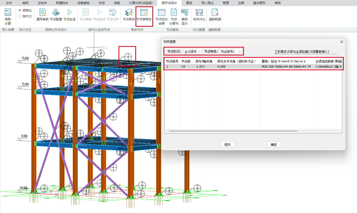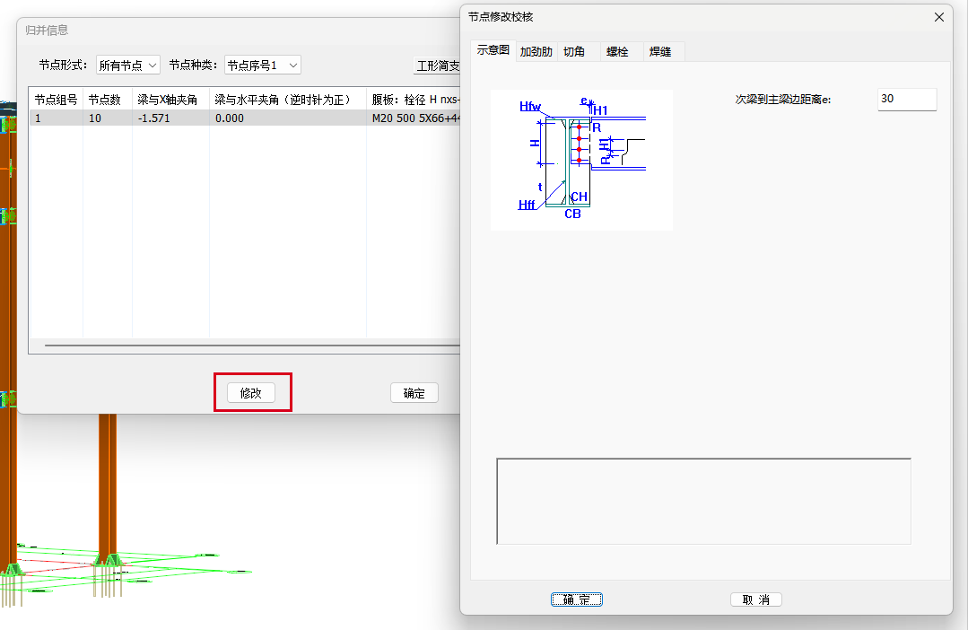 目录 搜索 展开 更新说明20251230版本更新说明更新概要1.协同模块更新点1.1通用机制1.2识图表收资⭐1.2.1操作流程介绍1.2.2功能特点1.3数据收资1.4接口1.4.1工艺协同类软件接口1.4.2计算类软件接口2.上部建模模块更新点2.1通用建模2.1.1工作树⭐2.1.2布置修改2.1.3高分屏适配⭐2.1.4楼板优化2.2快速建模⭐2.2.2快速布置水平撑2.2.1快速悬臂构件2.2.3快速洞边梁2.3智能建模2.3.1设备支架自动布梁2.4附属建模2.4.1直梯栏杆适配参数库模式2.4.2栏杆打断交互⭐3.计算模块更新点3.1荷载导荷3.2振动计算⭐3.3工况优化4.出图模块更新点4.1优化功能4.2新增海外出图模式5.基础模块更新点5.1基础模块更新点⭐5.2设备基础模块更新点5.2.1支持SH/T 3030-2025 石油化工塔型设备基础设计规范⭐5.2.2球形储罐设备及设备基础建模5.2.3支持卧式三支墩建模及计算5.2.4其他更新点1.总体介绍1.1基本功能介绍1.1.1 协同1.1.2 建模1.1.3 计算1.1.4 节点设计1.1.5 出图1.1.6 算量1.2软件界面1.2.1 菜单栏1.2.2 图形空间1.2.3 项目树1.2.4 快捷命令2.轴网2.1导入模型2.1.1导入PMCAD2.1.2增量导入PMcad2.2轴网标高2.2.1轴网标高2.2.2轴网编辑2.2.3标高编辑2.3工作面2.3.1创建工作面2.3.2工作面管理器2.3.3退出工作面2.3.4工作面的快捷按钮2.4修改工具2.4.1移动2.4.2复制2.4.3旋转2.4.4镜像2.4.5阵列2.4.6删除2.4.7拉伸2.4.8延伸2.4.9起坡2.5测量工具2.5.1测量长度2.5.2测量角度2.5.3测量面积2.5.4测量标高2.5.5测量坐标3.主构件3.1上部构件3.1.1柱3.1.2梁3.1.3支撑3.1.4快速次梁3.1.5快速支撑3.1.6拾取布置3.1.7截面刷3.2楼板3.2.1混凝土板3.2.2花纹钢板3.2.3钢格栅板3.2.4压型钢板3.2.5洞口3.2.6全房间洞3.2.7楼板设置3.2.8改板方向3.3修改3.3.1偏心对齐3.3.2构件删除3.3.3标高复制3.3.4主次梁3.3.5梁合并3.3.6梁拆分3.4基础构件3.4.1桩基3.5材料定义3.5.1全局材料3.5.2材料修改3.6显示3.6.1截面显示3.6.2构件显示3.6.3构件查找3.6.43D剖切3.6.5退出剖切4.附属构件4.1楼梯栏杆4.1.1钢直梯4.1.2钢斜梯4.1.3栏杆4.2附加构件4.2.1预埋件4.2.2地脚螺栓4.2.3翻边4.2.4钢平台4.2.5钢通道4.2.6支墩4.2.7支架4.2.8支吊架4.2.9T型支架4.2.10板式支架5.设备基础5.1收资5.1.1设备条件5.2地质资料5.2.1地质资料5.3总参5.3.1统一规定5.3.2自动生成基础规则5.4设备基础5.4.1卧式冷换设备基础5.4.2卧式容器基础5.4.3塔型设备基础5.4.4立式容器基础5.4.6管墩基础5.5设备支架5.5.1立式设备支架5.5.2卧式设备支架5.6汇总表5.6.1设备基础汇总表5.7计算6.协同6.1设备条件6.2工艺提资6.2.1荷载收资6.2.2洞口收资6.2.3埋件收资6.3智能生成6.3.1自动布梁6.4专业协同6.4.1发布设置6.4.2发布版本6.4.3参照6.5链接模型6.5.1链接P3D6.5.2链接管理7.荷载7.1荷载设置7.1.1工况管理7.1.2导荷方式7.1.3荷载显示7.2荷载布置7.2.1梁荷载7.2.2柱荷载7.2.3板均布荷载7.2.4板局部荷载7.2.5节点荷载7.3荷载快速布置7.3.1快速布置点荷载7.3.2快速布置线荷载7.3.3快速布置面荷载7.4荷载编辑7.4.1荷载修改7.4.2荷载删除7.4.3荷载清理7.4.4拾取布置7.5约束指定7.5.1支座约束7.5.2杆端约束7.5.3支座约束删除8.计算分析8.1设计层8.1.1模型检查8.1.2划分设计层8.2计算8.2.1生成分析模型8.2.2计算参数8.2.3计算8.3结果8.3.1数检定位8.3.2结果查看9.钢节点设计9.1导入结果9.1.1读取计算9.2设计方式9.3规格化节点设计9.3.1通用参数9.3.2节点配置9.3.3节点生成9.4按内力生成节点9.4.1节点参数9.4.2节点生成9.4.3节点归并9.5修改节点9.5.1节点修改9.5.2节点表修改9.6节点查询9.6.1节点设计结果9.6.2节点计算书9.6.3编号显示9.7内力查看9.8清除数据10.图纸10.1参数10.1.1 文字标准10.1.2 绘图参数10.2生成视图映射10.2.1 平面图10.2.2 立面图10.2.3 大样图10.2.4 节点图10.3填充修改10.4生成图纸10.5清单统计10.5.1 统计参数10.5.2 生成清单10.6导出图纸 暂无相关搜索结果! 9.5.2节点表修改 功能介绍【节点表修改】除在模型中直接选择节点进行修改外,程序还提供了一种通过列表选择节点的方法,即节点表修改。 选择节点表修改后,程序弹出节点列表对话框,同时模型中的节点上会显示相应的节点序号。用户可参考模型上的节点序号,从列表中迅速选择对应的节点进行修改。 具体的节点修改对话框及其内容细节与前文9.5.1节点修改一致。