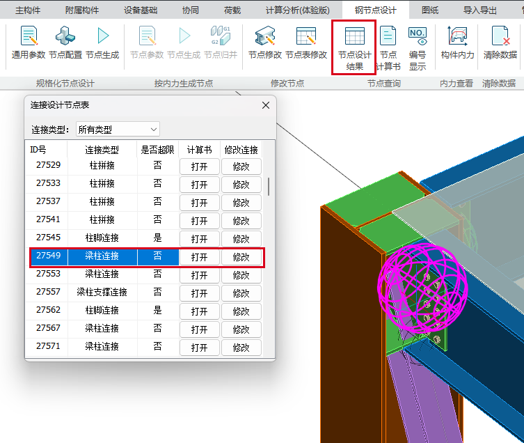 目录 搜索 展开 更新说明20251230版本更新说明更新概要1.协同模块更新点1.1通用机制1.2识图表收资⭐1.2.1操作流程介绍1.2.2功能特点1.3数据收资1.4接口1.4.1工艺协同类软件接口1.4.2计算类软件接口2.上部建模模块更新点2.1通用建模2.1.1工作树⭐2.1.2布置修改2.1.3高分屏适配⭐2.1.4楼板优化2.2快速建模⭐2.2.2快速布置水平撑2.2.1快速悬臂构件2.2.3快速洞边梁2.3智能建模2.3.1设备支架自动布梁2.4附属建模2.4.1直梯栏杆适配参数库模式2.4.2栏杆打断交互⭐3.计算模块更新点3.1荷载导荷3.2振动计算⭐3.3工况优化4.出图模块更新点4.1优化功能4.2新增海外出图模式5.基础模块更新点5.1基础模块更新点⭐5.2设备基础模块更新点5.2.1支持SH/T 3030-2025 石油化工塔型设备基础设计规范⭐5.2.2球形储罐设备及设备基础建模5.2.3支持卧式三支墩建模及计算5.2.4其他更新点1.总体介绍1.1基本功能介绍1.1.1 协同1.1.2 建模1.1.3 计算1.1.4 节点设计1.1.5 出图1.1.6 算量1.2软件界面1.2.1 菜单栏1.2.2 图形空间1.2.3 项目树1.2.4 快捷命令2.轴网2.1导入模型2.1.1导入PMCAD2.1.2增量导入PMcad2.2轴网标高2.2.1轴网标高2.2.2轴网编辑2.2.3标高编辑2.3工作面2.3.1创建工作面2.3.2工作面管理器2.3.3退出工作面2.3.4工作面的快捷按钮2.4修改工具2.4.1移动2.4.2复制2.4.3旋转2.4.4镜像2.4.5阵列2.4.6删除2.4.7拉伸2.4.8延伸2.4.9起坡2.5测量工具2.5.1测量长度2.5.2测量角度2.5.3测量面积2.5.4测量标高2.5.5测量坐标3.主构件3.1上部构件3.1.1柱3.1.2梁3.1.3支撑3.1.4快速次梁3.1.5快速支撑3.1.6拾取布置3.1.7截面刷3.2楼板3.2.1混凝土板3.2.2花纹钢板3.2.3钢格栅板3.2.4压型钢板3.2.5洞口3.2.6全房间洞3.2.7楼板设置3.2.8改板方向3.3修改3.3.1偏心对齐3.3.2构件删除3.3.3标高复制3.3.4主次梁3.3.5梁合并3.3.6梁拆分3.4基础构件3.4.1桩基3.5材料定义3.5.1全局材料3.5.2材料修改3.6显示3.6.1截面显示3.6.2构件显示3.6.3构件查找3.6.43D剖切3.6.5退出剖切4.附属构件4.1楼梯栏杆4.1.1钢直梯4.1.2钢斜梯4.1.3栏杆4.2附加构件4.2.1预埋件4.2.2地脚螺栓4.2.3翻边4.2.4钢平台4.2.5钢通道4.2.6支墩4.2.7支架4.2.8支吊架4.2.9T型支架4.2.10板式支架5.设备基础5.1收资5.1.1设备条件5.2地质资料5.2.1地质资料5.3总参5.3.1统一规定5.3.2自动生成基础规则5.4设备基础5.4.1卧式冷换设备基础5.4.2卧式容器基础5.4.3塔型设备基础5.4.4立式容器基础5.4.6管墩基础5.5设备支架5.5.1立式设备支架5.5.2卧式设备支架5.6汇总表5.6.1设备基础汇总表5.7计算6.协同6.1设备条件6.2工艺提资6.2.1荷载收资6.2.2洞口收资6.2.3埋件收资6.3智能生成6.3.1自动布梁6.4专业协同6.4.1发布设置6.4.2发布版本6.4.3参照6.5链接模型6.5.1链接P3D6.5.2链接管理7.荷载7.1荷载设置7.1.1工况管理7.1.2导荷方式7.1.3荷载显示7.2荷载布置7.2.1梁荷载7.2.2柱荷载7.2.3板均布荷载7.2.4板局部荷载7.2.5节点荷载7.3荷载快速布置7.3.1快速布置点荷载7.3.2快速布置线荷载7.3.3快速布置面荷载7.4荷载编辑7.4.1荷载修改7.4.2荷载删除7.4.3荷载清理7.4.4拾取布置7.5约束指定7.5.1支座约束7.5.2杆端约束7.5.3支座约束删除8.计算分析8.1设计层8.1.1模型检查8.1.2划分设计层8.2计算8.2.1生成分析模型8.2.2计算参数8.2.3计算8.3结果8.3.1数检定位8.3.2结果查看9.钢节点设计9.1导入结果9.1.1读取计算9.2设计方式9.3规格化节点设计9.3.1通用参数9.3.2节点配置9.3.3节点生成9.4按内力生成节点9.4.1节点参数9.4.2节点生成9.4.3节点归并9.5修改节点9.5.1节点修改9.5.2节点表修改9.6节点查询9.6.1节点设计结果9.6.2节点计算书9.6.3编号显示9.7内力查看9.8清除数据10.图纸10.1参数10.1.1 文字标准10.1.2 绘图参数10.2生成视图映射10.2.1 平面图10.2.2 立面图10.2.3 大样图10.2.4 节点图10.3填充修改10.4生成图纸10.5清单统计10.5.1 统计参数10.5.2 生成清单10.6导出图纸 暂无相关搜索结果! 9.6.1节点设计结果 功能介绍为便于查验节点设计结果,可利用【节点设计结果】功能,以列表形式全面展示所有节点信息,迅速核对节点是否超限。 该列表支持按连接类型进行分类,并支持双击定位,同时允许查看节点设计计算书和进行节点修改。