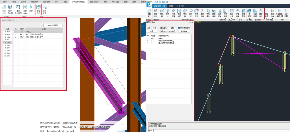 目录 搜索 展开 更新说明20251230版本更新说明更新概要1.协同模块更新点1.1通用机制1.2识图表收资⭐1.2.1操作流程介绍1.2.2功能特点1.3数据收资1.4接口1.4.1工艺协同类软件接口1.4.2计算类软件接口2.上部建模模块更新点2.1通用建模2.1.1工作树⭐2.1.2布置修改2.1.3高分屏适配⭐2.1.4楼板优化2.2快速建模⭐2.2.2快速布置水平撑2.2.1快速悬臂构件2.2.3快速洞边梁2.3智能建模2.3.1设备支架自动布梁2.4附属建模2.4.1直梯栏杆适配参数库模式2.4.2栏杆打断交互⭐3.计算模块更新点3.1荷载导荷3.2振动计算⭐3.3工况优化4.出图模块更新点4.1优化功能4.2新增海外出图模式5.基础模块更新点5.1基础模块更新点⭐5.2设备基础模块更新点5.2.1支持SH/T 3030-2025 石油化工塔型设备基础设计规范⭐5.2.2球形储罐设备及设备基础建模5.2.3支持卧式三支墩建模及计算5.2.4其他更新点1.总体介绍1.1基本功能介绍1.1.1 协同1.1.2 建模1.1.3 计算1.1.4 节点设计1.1.5 出图1.1.6 算量1.2软件界面1.2.1 菜单栏1.2.2 图形空间1.2.3 项目树1.2.4 快捷命令2.轴网2.1导入模型2.1.1导入PMCAD2.1.2增量导入PMcad2.2轴网标高2.2.1轴网标高2.2.2轴网编辑2.2.3标高编辑2.3工作面2.3.1创建工作面2.3.2工作面管理器2.3.3退出工作面2.3.4工作面的快捷按钮2.4修改工具2.4.1移动2.4.2复制2.4.3旋转2.4.4镜像2.4.5阵列2.4.6删除2.4.7拉伸2.4.8延伸2.4.9起坡2.5测量工具2.5.1测量长度2.5.2测量角度2.5.3测量面积2.5.4测量标高2.5.5测量坐标3.主构件3.1上部构件3.1.1柱3.1.2梁3.1.3支撑3.1.4快速次梁3.1.5快速支撑3.1.6拾取布置3.1.7截面刷3.2楼板3.2.1混凝土板3.2.2花纹钢板3.2.3钢格栅板3.2.4压型钢板3.2.5洞口3.2.6全房间洞3.2.7楼板设置3.2.8改板方向3.3修改3.3.1偏心对齐3.3.2构件删除3.3.3标高复制3.3.4主次梁3.3.5梁合并3.3.6梁拆分3.4基础构件3.4.1桩基3.5材料定义3.5.1全局材料3.5.2材料修改3.6显示3.6.1截面显示3.6.2构件显示3.6.3构件查找3.6.43D剖切3.6.5退出剖切4.附属构件4.1楼梯栏杆4.1.1钢直梯4.1.2钢斜梯4.1.3栏杆4.2附加构件4.2.1预埋件4.2.2地脚螺栓4.2.3翻边4.2.4钢平台4.2.5钢通道4.2.6支墩4.2.7支架4.2.8支吊架4.2.9T型支架4.2.10板式支架5.设备基础5.1收资5.1.1设备条件5.2地质资料5.2.1地质资料5.3总参5.3.1统一规定5.3.2自动生成基础规则5.4设备基础5.4.1卧式冷换设备基础5.4.2卧式容器基础5.4.3塔型设备基础5.4.4立式容器基础5.4.6管墩基础5.5设备支架5.5.1立式设备支架5.5.2卧式设备支架5.6汇总表5.6.1设备基础汇总表5.7计算6.协同6.1设备条件6.2工艺提资6.2.1荷载收资6.2.2洞口收资6.2.3埋件收资6.3智能生成6.3.1自动布梁6.4专业协同6.4.1发布设置6.4.2发布版本6.4.3参照6.5链接模型6.5.1链接P3D6.5.2链接管理7.荷载7.1荷载设置7.1.1工况管理7.1.2导荷方式7.1.3荷载显示7.2荷载布置7.2.1梁荷载7.2.2柱荷载7.2.3板均布荷载7.2.4板局部荷载7.2.5节点荷载7.3荷载快速布置7.3.1快速布置点荷载7.3.2快速布置线荷载7.3.3快速布置面荷载7.4荷载编辑7.4.1荷载修改7.4.2荷载删除7.4.3荷载清理7.4.4拾取布置7.5约束指定7.5.1支座约束7.5.2杆端约束7.5.3支座约束删除8.计算分析8.1设计层8.1.1模型检查8.1.2划分设计层8.2计算8.2.1生成分析模型8.2.2计算参数8.2.3计算8.3结果8.3.1数检定位8.3.2结果查看9.钢节点设计9.1导入结果9.1.1读取计算9.2设计方式9.3规格化节点设计9.3.1通用参数9.3.2节点配置9.3.3节点生成9.4按内力生成节点9.4.1节点参数9.4.2节点生成9.4.3节点归并9.5修改节点9.5.1节点修改9.5.2节点表修改9.6节点查询9.6.1节点设计结果9.6.2节点计算书9.6.3编号显示9.7内力查看9.8清除数据10.图纸10.1参数10.1.1 文字标准10.1.2 绘图参数10.2生成视图映射10.2.1 平面图10.2.2 立面图10.2.3 大样图10.2.4 节点图10.3填充修改10.4生成图纸10.5清单统计10.5.1 统计参数10.5.2 生成清单10.6导出图纸 暂无相关搜索结果! 8.3.1数检定位 功能介绍【数检定位】能够读取SATWE前处理的数据检查信息,此模块功能与PKPM主程序中的SATWE模块一致,在此程序内可查看和定位相关错误位置。点击“SATWE数检报告”则弹出check.out文件。