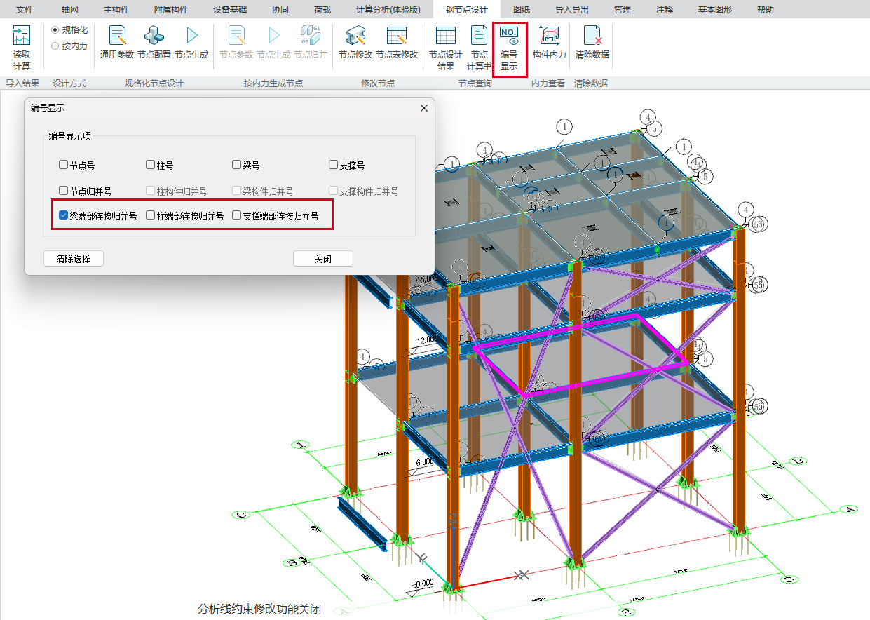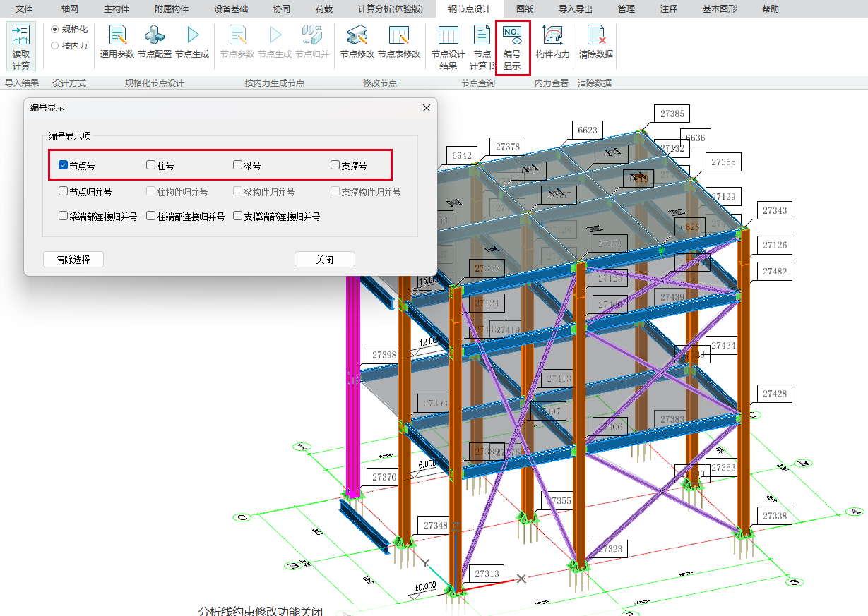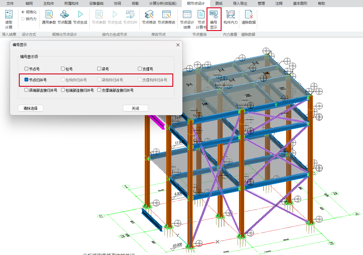 目录 搜索 展开 更新说明20251230版本更新说明更新概要1.协同模块更新点1.1通用机制1.2识图表收资⭐1.2.1操作流程介绍1.2.2功能特点1.3数据收资1.4接口1.4.1工艺协同类软件接口1.4.2计算类软件接口2.上部建模模块更新点2.1通用建模2.1.1工作树⭐2.1.2布置修改2.1.3高分屏适配⭐2.1.4楼板优化2.2快速建模⭐2.2.2快速布置水平撑2.2.1快速悬臂构件2.2.3快速洞边梁2.3智能建模2.3.1设备支架自动布梁2.4附属建模2.4.1直梯栏杆适配参数库模式2.4.2栏杆打断交互⭐3.计算模块更新点3.1荷载导荷3.2振动计算⭐3.3工况优化4.出图模块更新点4.1优化功能4.2新增海外出图模式5.基础模块更新点5.1基础模块更新点⭐5.2设备基础模块更新点5.2.1支持SH/T 3030-2025 石油化工塔型设备基础设计规范⭐5.2.2球形储罐设备及设备基础建模5.2.3支持卧式三支墩建模及计算5.2.4其他更新点1.总体介绍1.1基本功能介绍1.1.1 协同1.1.2 建模1.1.3 计算1.1.4 节点设计1.1.5 出图1.1.6 算量1.2软件界面1.2.1 菜单栏1.2.2 图形空间1.2.3 项目树1.2.4 快捷命令2.轴网2.1导入模型2.1.1导入PMCAD2.1.2增量导入PMcad2.2轴网标高2.2.1轴网标高2.2.2轴网编辑2.2.3标高编辑2.3工作面2.3.1创建工作面2.3.2工作面管理器2.3.3退出工作面2.3.4工作面的快捷按钮2.4修改工具2.4.1移动2.4.2复制2.4.3旋转2.4.4镜像2.4.5阵列2.4.6删除2.4.7拉伸2.4.8延伸2.4.9起坡2.5测量工具2.5.1测量长度2.5.2测量角度2.5.3测量面积2.5.4测量标高2.5.5测量坐标3.主构件3.1上部构件3.1.1柱3.1.2梁3.1.3支撑3.1.4快速次梁3.1.5快速支撑3.1.6拾取布置3.1.7截面刷3.2楼板3.2.1混凝土板3.2.2花纹钢板3.2.3钢格栅板3.2.4压型钢板3.2.5洞口3.2.6全房间洞3.2.7楼板设置3.2.8改板方向3.3修改3.3.1偏心对齐3.3.2构件删除3.3.3标高复制3.3.4主次梁3.3.5梁合并3.3.6梁拆分3.4基础构件3.4.1桩基3.5材料定义3.5.1全局材料3.5.2材料修改3.6显示3.6.1截面显示3.6.2构件显示3.6.3构件查找3.6.43D剖切3.6.5退出剖切4.附属构件4.1楼梯栏杆4.1.1钢直梯4.1.2钢斜梯4.1.3栏杆4.2附加构件4.2.1预埋件4.2.2地脚螺栓4.2.3翻边4.2.4钢平台4.2.5钢通道4.2.6支墩4.2.7支架4.2.8支吊架4.2.9T型支架4.2.10板式支架5.设备基础5.1收资5.1.1设备条件5.2地质资料5.2.1地质资料5.3总参5.3.1统一规定5.3.2自动生成基础规则5.4设备基础5.4.1卧式冷换设备基础5.4.2卧式容器基础5.4.3塔型设备基础5.4.4立式容器基础5.4.6管墩基础5.5设备支架5.5.1立式设备支架5.5.2卧式设备支架5.6汇总表5.6.1设备基础汇总表5.7计算6.协同6.1设备条件6.2工艺提资6.2.1荷载收资6.2.2洞口收资6.2.3埋件收资6.3智能生成6.3.1自动布梁6.4专业协同6.4.1发布设置6.4.2发布版本6.4.3参照6.5链接模型6.5.1链接P3D6.5.2链接管理7.荷载7.1荷载设置7.1.1工况管理7.1.2导荷方式7.1.3荷载显示7.2荷载布置7.2.1梁荷载7.2.2柱荷载7.2.3板均布荷载7.2.4板局部荷载7.2.5节点荷载7.3荷载快速布置7.3.1快速布置点荷载7.3.2快速布置线荷载7.3.3快速布置面荷载7.4荷载编辑7.4.1荷载修改7.4.2荷载删除7.4.3荷载清理7.4.4拾取布置7.5约束指定7.5.1支座约束7.5.2杆端约束7.5.3支座约束删除8.计算分析8.1设计层8.1.1模型检查8.1.2划分设计层8.2计算8.2.1生成分析模型8.2.2计算参数8.2.3计算8.3结果8.3.1数检定位8.3.2结果查看9.钢节点设计9.1导入结果9.1.1读取计算9.2设计方式9.3规格化节点设计9.3.1通用参数9.3.2节点配置9.3.3节点生成9.4按内力生成节点9.4.1节点参数9.4.2节点生成9.4.3节点归并9.5修改节点9.5.1节点修改9.5.2节点表修改9.6节点查询9.6.1节点设计结果9.6.2节点计算书9.6.3编号显示9.7内力查看9.8清除数据10.图纸10.1参数10.1.1 文字标准10.1.2 绘图参数10.2生成视图映射10.2.1 平面图10.2.2 立面图10.2.3 大样图10.2.4 节点图10.3填充修改10.4生成图纸10.5清单统计10.5.1 统计参数10.5.2 生成清单10.6导出图纸 暂无相关搜索结果! 9.6.3编号显示 功能介绍【编号显示】在模型中展示各类节点及构件的编号,便于用户查看。可显示的编号类型包括: 第一类:节点号、柱号、梁号、支撑号 第二类:节点归并号、柱构件归并号、梁构件归并号、支撑构件归并号 第三类:梁端部连接归并号、柱端部连接归并号、支撑端部连接归并号