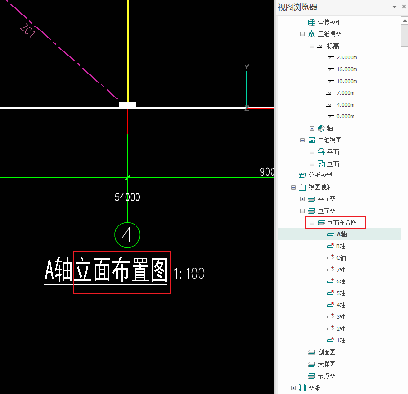 【轴号选择】中的轴号选项在生成立面图时,与上述【类别名】共同组成图纸下方的“完整图名”,同时作为视图浏览器中立面图节点名下的子节点。