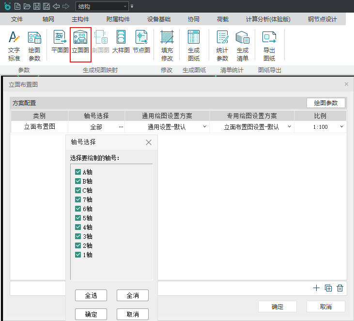 在方案配置中,可通过【类别】、【轴号选择】、【通用绘图设置方案】、【专用绘图设置方案】、【比例】来制定每一类立面图的出图内容。并且可通过添加、复制、修改功能去配置和管理立面图出图方案。【通用绘图设置方案】和【专用绘图设置方案】的设置和修改,支持通过右上角的绘图参数按钮调出【绘图参数】对话框。