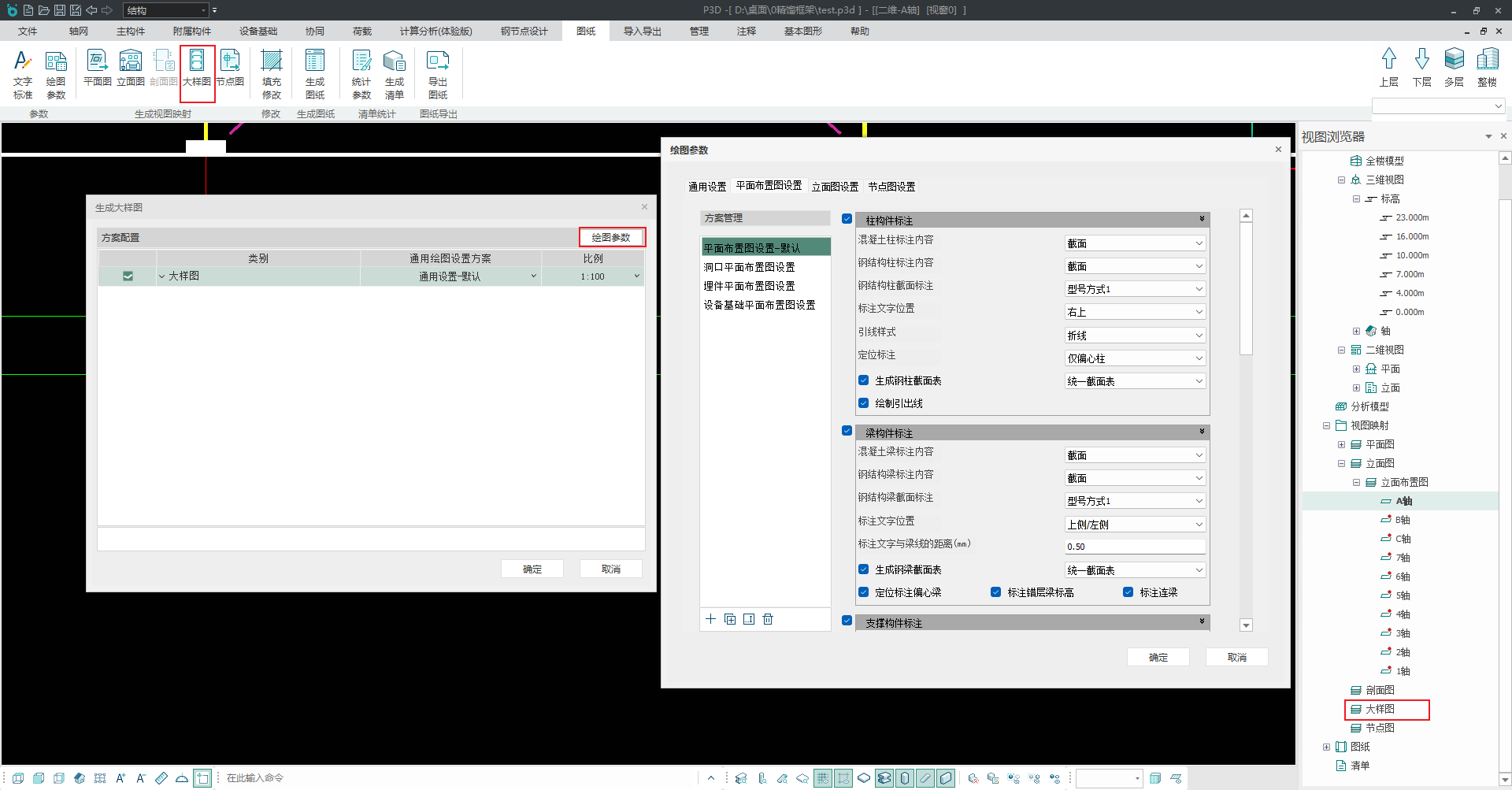 在方案配置中,可通过【类别】、【通用绘图设置方案】、【比例】来控制每一类大样图的出图样式。【通用绘图设置方案】的设置和修改,支持通过右上角的绘图参数按钮调出【绘图参数】对话框。