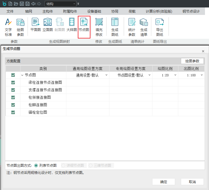 在方案配置中,可通过【类别】、【通用绘图设置方案】、【专用绘图设置方案】、【绘图比例】、【出图比例】来控制每一类节点图的出图样式。【通用绘图设置方案】和【专用绘图设置方案】的设置和修改,支持通过右上角的绘图参数按钮调出【绘图参数】对话框。