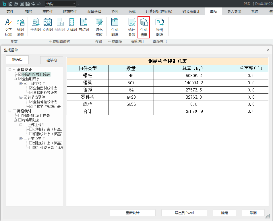 目录 搜索 展开 更新说明20251230版本更新说明更新概要1.协同模块更新点1.1通用机制1.2识图表收资⭐1.2.1操作流程介绍1.2.2功能特点1.3数据收资1.4接口1.4.1工艺协同类软件接口1.4.2计算类软件接口2.上部建模模块更新点2.1通用建模2.1.1工作树⭐2.1.2布置修改2.1.3高分屏适配⭐2.1.4楼板优化2.2快速建模⭐2.2.2快速布置水平撑2.2.1快速悬臂构件2.2.3快速洞边梁2.3智能建模2.3.1设备支架自动布梁2.4附属建模2.4.1直梯栏杆适配参数库模式2.4.2栏杆打断交互⭐3.计算模块更新点3.1荷载导荷3.2振动计算⭐3.3工况优化4.出图模块更新点4.1优化功能4.2新增海外出图模式5.基础模块更新点5.1基础模块更新点⭐5.2设备基础模块更新点5.2.1支持SH/T 3030-2025 石油化工塔型设备基础设计规范⭐5.2.2球形储罐设备及设备基础建模5.2.3支持卧式三支墩建模及计算5.2.4其他更新点1.总体介绍1.1基本功能介绍1.1.1 协同1.1.2 建模1.1.3 计算1.1.4 节点设计1.1.5 出图1.1.6 算量1.2软件界面1.2.1 菜单栏1.2.2 图形空间1.2.3 项目树1.2.4 快捷命令2.轴网2.1导入模型2.1.1导入PMCAD2.1.2增量导入PMcad2.2轴网标高2.2.1轴网标高2.2.2轴网编辑2.2.3标高编辑2.3工作面2.3.1创建工作面2.3.2工作面管理器2.3.3退出工作面2.3.4工作面的快捷按钮2.4修改工具2.4.1移动2.4.2复制2.4.3旋转2.4.4镜像2.4.5阵列2.4.6删除2.4.7拉伸2.4.8延伸2.4.9起坡2.5测量工具2.5.1测量长度2.5.2测量角度2.5.3测量面积2.5.4测量标高2.5.5测量坐标3.主构件3.1上部构件3.1.1柱3.1.2梁3.1.3支撑3.1.4快速次梁3.1.5快速支撑3.1.6拾取布置3.1.7截面刷3.2楼板3.2.1混凝土板3.2.2花纹钢板3.2.3钢格栅板3.2.4压型钢板3.2.5洞口3.2.6全房间洞3.2.7楼板设置3.2.8改板方向3.3修改3.3.1偏心对齐3.3.2构件删除3.3.3标高复制3.3.4主次梁3.3.5梁合并3.3.6梁拆分3.4基础构件3.4.1桩基3.5材料定义3.5.1全局材料3.5.2材料修改3.6显示3.6.1截面显示3.6.2构件显示3.6.3构件查找3.6.43D剖切3.6.5退出剖切4.附属构件4.1楼梯栏杆4.1.1钢直梯4.1.2钢斜梯4.1.3栏杆4.2附加构件4.2.1预埋件4.2.2地脚螺栓4.2.3翻边4.2.4钢平台4.2.5钢通道4.2.6支墩4.2.7支架4.2.8支吊架4.2.9T型支架4.2.10板式支架5.设备基础5.1收资5.1.1设备条件5.2地质资料5.2.1地质资料5.3总参5.3.1统一规定5.3.2自动生成基础规则5.4设备基础5.4.1卧式冷换设备基础5.4.2卧式容器基础5.4.3塔型设备基础5.4.4立式容器基础5.4.6管墩基础5.5设备支架5.5.1立式设备支架5.5.2卧式设备支架5.6汇总表5.6.1设备基础汇总表5.7计算6.协同6.1设备条件6.2工艺提资6.2.1荷载收资6.2.2洞口收资6.2.3埋件收资6.3智能生成6.3.1自动布梁6.4专业协同6.4.1发布设置6.4.2发布版本6.4.3参照6.5链接模型6.5.1链接P3D6.5.2链接管理7.荷载7.1荷载设置7.1.1工况管理7.1.2导荷方式7.1.3荷载显示7.2荷载布置7.2.1梁荷载7.2.2柱荷载7.2.3板均布荷载7.2.4板局部荷载7.2.5节点荷载7.3荷载快速布置7.3.1快速布置点荷载7.3.2快速布置线荷载7.3.3快速布置面荷载7.4荷载编辑7.4.1荷载修改7.4.2荷载删除7.4.3荷载清理7.4.4拾取布置7.5约束指定7.5.1支座约束7.5.2杆端约束7.5.3支座约束删除8.计算分析8.1设计层8.1.1模型检查8.1.2划分设计层8.2计算8.2.1生成分析模型8.2.2计算参数8.2.3计算8.3结果8.3.1数检定位8.3.2结果查看9.钢节点设计9.1导入结果9.1.1读取计算9.2设计方式9.3规格化节点设计9.3.1通用参数9.3.2节点配置9.3.3节点生成9.4按内力生成节点9.4.1节点参数9.4.2节点生成9.4.3节点归并9.5修改节点9.5.1节点修改9.5.2节点表修改9.6节点查询9.6.1节点设计结果9.6.2节点计算书9.6.3编号显示9.7内力查看9.8清除数据10.图纸10.1参数10.1.1 文字标准10.1.2 绘图参数10.2生成视图映射10.2.1 平面图10.2.2 立面图10.2.3 大样图10.2.4 节点图10.3填充修改10.4生成图纸10.5清单统计10.5.1 统计参数10.5.2 生成清单10.6导出图纸 暂无相关搜索结果! 10.5.2 生成清单 点击菜单中【生成清单】按钮,便可弹出【生成清单】对话框,如下图所示。统计时,钢结构和砼结构分别统计,后续将补充基础构件的统计。统计范围,分为全楼统计和标高统计。每个统计范围内又分为汇总表和明细表。汇总表将明细表中的大类分别汇总起来,便于总体统计。明细表按构件类型分别统计,在钢结构中,首先分为上部主构件和钢节点零部件。砼结构大致一样。具体组织架构如下图所示: 后续软件会陆续增加附属构件的统计、以及钢结构防火防腐等清单的统计。