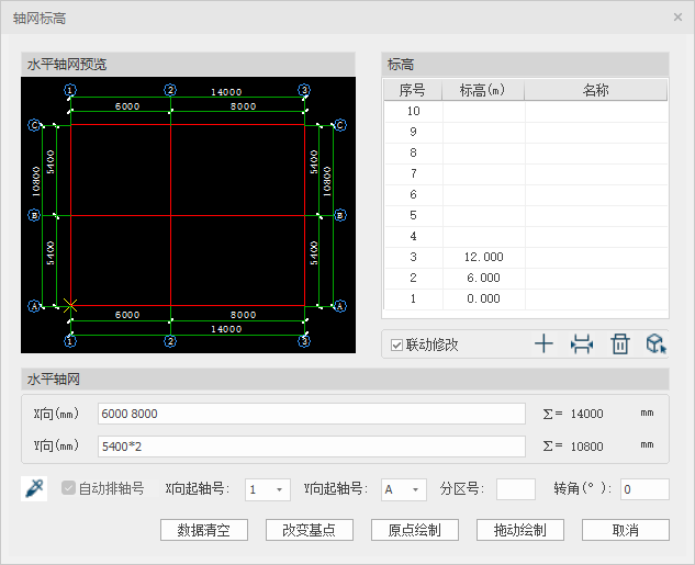 目前针对正交轴网,提供参数化的快捷绘制水平轴网及竖向标高的建立。
