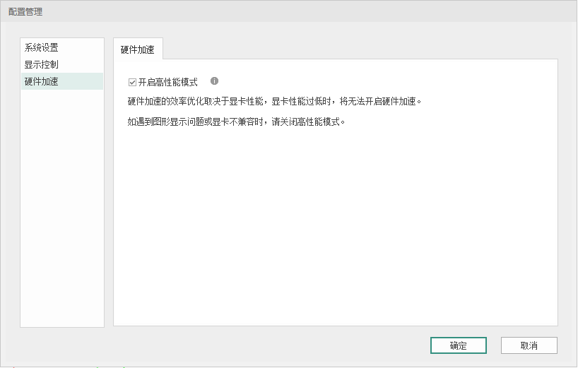 硬件加速默认勾选【开启高性能模式】,软件自动根据计算机显卡提升图形显示效率和渲染效果,当出现图形显示异常时可以取消该选项。