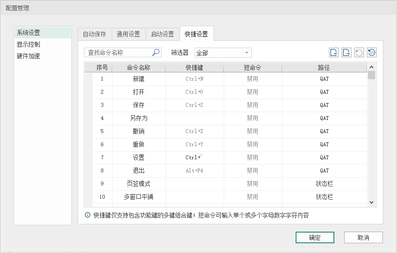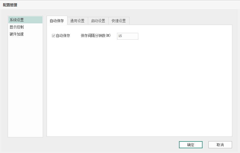 系统设置项中提供设置【自动保存】时长,软件按照此设置自动间隔保存备份工程数据。【通用设置】和【启动设置】可以按照软件中默认项,不建议修改。【快捷设置】用于管理软件中字母快捷键键,设计师可按照自己的交互习惯修改,提高软件操作效率;