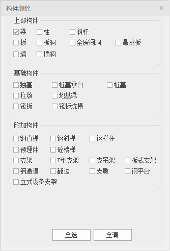 【构件删除】:构件删除命令,点击后弹出构件删除对话框,勾选构件类型后,可在图面“点带框选”交互删除对应构件。