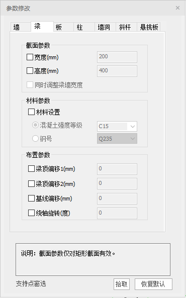 【单参修改】:构件修改命令,点击后弹出构件参数修改对话框,设置或拾取构件截面、材料、布置参数后,可在图面“点带框选”交互修改相应构件的参数。