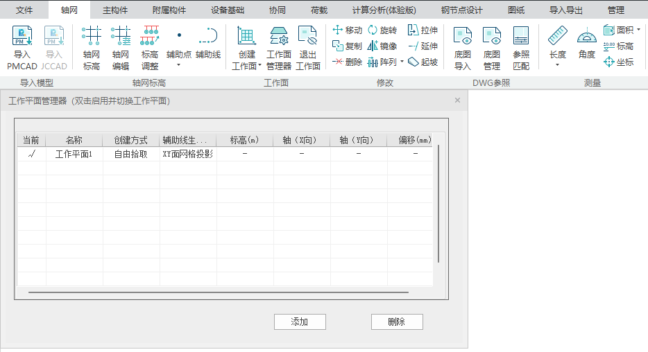 通过工作平面管理器工具,可以查看所有创建的工作平面数据(激活状态、名称、工作平面原点和XY轴向量等信息),同时支持开启、关闭工作平面和新建工作平面等操作。