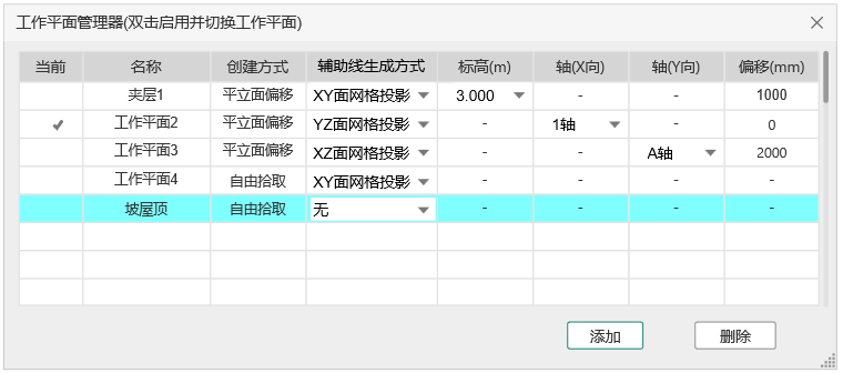 【当前】双击表格各行可切换工作平面,同时【当前】列打勾;同时只能起用一个工作平面。