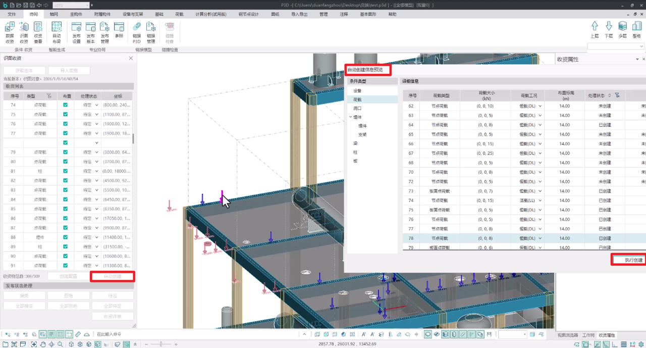 目录 搜索 展开 更新说明20251230版本更新说明更新概要1.协同模块更新点1.1通用机制1.2识图表收资⭐1.2.1操作流程介绍1.2.2功能特点1.3数据收资1.4接口1.4.1工艺协同类软件接口1.4.2计算类软件接口2.上部建模模块更新点2.1通用建模2.1.1工作树⭐2.1.2布置修改2.1.3高分屏适配⭐2.1.4楼板优化2.2快速建模⭐2.2.2快速布置水平撑2.2.1快速悬臂构件2.2.3快速洞边梁2.3智能建模2.3.1设备支架自动布梁2.4附属建模2.4.1直梯栏杆适配参数库模式2.4.2栏杆打断交互⭐3.计算模块更新点3.1荷载导荷3.2振动计算⭐3.3工况优化4.出图模块更新点4.1优化功能4.2新增海外出图模式5.基础模块更新点5.1基础模块更新点⭐5.2设备基础模块更新点5.2.1支持SH/T 3030-2025 石油化工塔型设备基础设计规范⭐5.2.2球形储罐设备及设备基础建模5.2.3支持卧式三支墩建模及计算5.2.4其他更新点1.总体介绍1.1基本功能介绍1.1.1 协同1.1.2 建模1.1.3 计算1.1.4 节点设计1.1.5 出图1.1.6 算量1.2软件界面1.2.1 菜单栏1.2.2 图形空间1.2.3 项目树1.2.4 快捷命令2.轴网2.1导入模型2.1.1导入PMCAD2.1.2增量导入PMcad2.2轴网标高2.2.1轴网标高2.2.2轴网编辑2.2.3标高编辑2.3工作面2.3.1创建工作面2.3.2工作面管理器2.3.3退出工作面2.3.4工作面的快捷按钮2.4修改工具2.4.1移动2.4.2复制2.4.3旋转2.4.4镜像2.4.5阵列2.4.6删除2.4.7拉伸2.4.8延伸2.4.9起坡2.5测量工具2.5.1测量长度2.5.2测量角度2.5.3测量面积2.5.4测量标高2.5.5测量坐标3.主构件3.1上部构件3.1.1柱3.1.2梁3.1.3支撑3.1.4快速次梁3.1.5快速支撑3.1.6拾取布置3.1.7截面刷3.2楼板3.2.1混凝土板3.2.2花纹钢板3.2.3钢格栅板3.2.4压型钢板3.2.5洞口3.2.6全房间洞3.2.7楼板设置3.2.8改板方向3.3修改3.3.1偏心对齐3.3.2构件删除3.3.3标高复制3.3.4主次梁3.3.5梁合并3.3.6梁拆分3.4基础构件3.4.1桩基3.5材料定义3.5.1全局材料3.5.2材料修改3.6显示3.6.1截面显示3.6.2构件显示3.6.3构件查找3.6.43D剖切3.6.5退出剖切4.附属构件4.1楼梯栏杆4.1.1钢直梯4.1.2钢斜梯4.1.3栏杆4.2附加构件4.2.1预埋件4.2.2地脚螺栓4.2.3翻边4.2.4钢平台4.2.5钢通道4.2.6支墩4.2.7支架4.2.8支吊架4.2.9T型支架4.2.10板式支架5.设备基础5.1收资5.1.1设备条件5.2地质资料5.2.1地质资料5.3总参5.3.1统一规定5.3.2自动生成基础规则5.4设备基础5.4.1卧式冷换设备基础5.4.2卧式容器基础5.4.3塔型设备基础5.4.4立式容器基础5.4.6管墩基础5.5设备支架5.5.1立式设备支架5.5.2卧式设备支架5.6汇总表5.6.1设备基础汇总表5.7计算6.协同6.1设备条件6.2工艺提资6.2.1荷载收资6.2.2洞口收资6.2.3埋件收资6.3智能生成6.3.1自动布梁6.4专业协同6.4.1发布设置6.4.2发布版本6.4.3参照6.5链接模型6.5.1链接P3D6.5.2链接管理7.荷载7.1荷载设置7.1.1工况管理7.1.2导荷方式7.1.3荷载显示7.2荷载布置7.2.1梁荷载7.2.2柱荷载7.2.3板均布荷载7.2.4板局部荷载7.2.5节点荷载7.3荷载快速布置7.3.1快速布置点荷载7.3.2快速布置线荷载7.3.3快速布置面荷载7.4荷载编辑7.4.1荷载修改7.4.2荷载删除7.4.3荷载清理7.4.4拾取布置7.5约束指定7.5.1支座约束7.5.2杆端约束7.5.3支座约束删除8.计算分析8.1设计层8.1.1模型检查8.1.2划分设计层8.2计算8.2.1生成分析模型8.2.2计算参数8.2.3计算8.3结果8.3.1数检定位8.3.2结果查看9.钢节点设计9.1导入结果9.1.1读取计算9.2设计方式9.3规格化节点设计9.3.1通用参数9.3.2节点配置9.3.3节点生成9.4按内力生成节点9.4.1节点参数9.4.2节点生成9.4.3节点归并9.5修改节点9.5.1节点修改9.5.2节点表修改9.6节点查询9.6.1节点设计结果9.6.2节点计算书9.6.3编号显示9.7内力查看9.8清除数据10.图纸10.1参数10.1.1 文字标准10.1.2 绘图参数10.2生成视图映射10.2.1 平面图10.2.2 立面图10.2.3 大样图10.2.4 节点图10.3填充修改10.4生成图纸10.5清单统计10.5.1 统计参数10.5.2 生成清单10.6导出图纸 暂无相关搜索结果! 1.2.2功能特点 自动对位 支持图纸自动拆分和图名识别;自动根据轴线交点对位,同时支持人工调整。全楼识别一次性完成全楼/任意范围内的条件信息提取。一次配置集中处理整合各类收资对象的创建配置,集中处理各类判断条件、支持自动布梁、自动布板,支持自定义各类构件默认值等。两步创建模型雏形。生成预览,开放调整