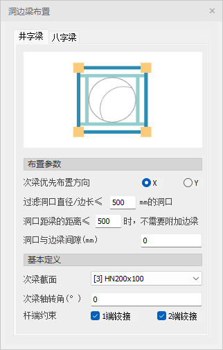 目录 搜索 展开 更新说明20251230版本更新说明更新概要1.协同模块更新点1.1通用机制1.2识图表收资⭐1.2.1操作流程介绍1.2.2功能特点1.3数据收资1.4接口1.4.1工艺协同类软件接口1.4.2计算类软件接口2.上部建模模块更新点2.1通用建模2.1.1工作树⭐2.1.2布置修改2.1.3高分屏适配⭐2.1.4楼板优化2.2快速建模⭐2.2.2快速布置水平撑2.2.1快速悬臂构件2.2.3快速洞边梁2.3智能建模2.3.1设备支架自动布梁2.4附属建模2.4.1直梯栏杆适配参数库模式2.4.2栏杆打断交互⭐3.计算模块更新点3.1荷载导荷3.2振动计算⭐3.3工况优化4.出图模块更新点4.1优化功能4.2新增海外出图模式5.基础模块更新点5.1基础模块更新点⭐5.2设备基础模块更新点5.2.1支持SH/T 3030-2025 石油化工塔型设备基础设计规范⭐5.2.2球形储罐设备及设备基础建模5.2.3支持卧式三支墩建模及计算5.2.4其他更新点1.总体介绍1.1基本功能介绍1.1.1 协同1.1.2 建模1.1.3 计算1.1.4 节点设计1.1.5 出图1.1.6 算量1.2软件界面1.2.1 菜单栏1.2.2 图形空间1.2.3 项目树1.2.4 快捷命令2.轴网2.1导入模型2.1.1导入PMCAD2.1.2增量导入PMcad2.2轴网标高2.2.1轴网标高2.2.2轴网编辑2.2.3标高编辑2.3工作面2.3.1创建工作面2.3.2工作面管理器2.3.3退出工作面2.3.4工作面的快捷按钮2.4修改工具2.4.1移动2.4.2复制2.4.3旋转2.4.4镜像2.4.5阵列2.4.6删除2.4.7拉伸2.4.8延伸2.4.9起坡2.5测量工具2.5.1测量长度2.5.2测量角度2.5.3测量面积2.5.4测量标高2.5.5测量坐标3.主构件3.1上部构件3.1.1柱3.1.2梁3.1.3支撑3.1.4快速次梁3.1.5快速支撑3.1.6拾取布置3.1.7截面刷3.2楼板3.2.1混凝土板3.2.2花纹钢板3.2.3钢格栅板3.2.4压型钢板3.2.5洞口3.2.6全房间洞3.2.7楼板设置3.2.8改板方向3.3修改3.3.1偏心对齐3.3.2构件删除3.3.3标高复制3.3.4主次梁3.3.5梁合并3.3.6梁拆分3.4基础构件3.4.1桩基3.5材料定义3.5.1全局材料3.5.2材料修改3.6显示3.6.1截面显示3.6.2构件显示3.6.3构件查找3.6.43D剖切3.6.5退出剖切4.附属构件4.1楼梯栏杆4.1.1钢直梯4.1.2钢斜梯4.1.3栏杆4.2附加构件4.2.1预埋件4.2.2地脚螺栓4.2.3翻边4.2.4钢平台4.2.5钢通道4.2.6支墩4.2.7支架4.2.8支吊架4.2.9T型支架4.2.10板式支架5.设备基础5.1收资5.1.1设备条件5.2地质资料5.2.1地质资料5.3总参5.3.1统一规定5.3.2自动生成基础规则5.4设备基础5.4.1卧式冷换设备基础5.4.2卧式容器基础5.4.3塔型设备基础5.4.4立式容器基础5.4.6管墩基础5.5设备支架5.5.1立式设备支架5.5.2卧式设备支架5.6汇总表5.6.1设备基础汇总表5.7计算6.协同6.1设备条件6.2工艺提资6.2.1荷载收资6.2.2洞口收资6.2.3埋件收资6.3智能生成6.3.1自动布梁6.4专业协同6.4.1发布设置6.4.2发布版本6.4.3参照6.5链接模型6.5.1链接P3D6.5.2链接管理7.荷载7.1荷载设置7.1.1工况管理7.1.2导荷方式7.1.3荷载显示7.2荷载布置7.2.1梁荷载7.2.2柱荷载7.2.3板均布荷载7.2.4板局部荷载7.2.5节点荷载7.3荷载快速布置7.3.1快速布置点荷载7.3.2快速布置线荷载7.3.3快速布置面荷载7.4荷载编辑7.4.1荷载修改7.4.2荷载删除7.4.3荷载清理7.4.4拾取布置7.5约束指定7.5.1支座约束7.5.2杆端约束7.5.3支座约束删除8.计算分析8.1设计层8.1.1模型检查8.1.2划分设计层8.2计算8.2.1生成分析模型8.2.2计算参数8.2.3计算8.3结果8.3.1数检定位8.3.2结果查看9.钢节点设计9.1导入结果9.1.1读取计算9.2设计方式9.3规格化节点设计9.3.1通用参数9.3.2节点配置9.3.3节点生成9.4按内力生成节点9.4.1节点参数9.4.2节点生成9.4.3节点归并9.5修改节点9.5.1节点修改9.5.2节点表修改9.6节点查询9.6.1节点设计结果9.6.2节点计算书9.6.3编号显示9.7内力查看9.8清除数据10.图纸10.1参数10.1.1 文字标准10.1.2 绘图参数10.2生成视图映射10.2.1 平面图10.2.2 立面图10.2.3 大样图10.2.4 节点图10.3填充修改10.4生成图纸10.5清单统计10.5.1 统计参数10.5.2 生成清单10.6导出图纸 暂无相关搜索结果! 2.2.3快速洞边梁 洞边梁布置 新增洞边梁快速布置工具,支持大洞口、小洞口快速布置井字梁及八字梁 【井字梁】:支持大小洞口布置井字梁,可以参数化控制次梁截面、一级次梁方向、杆端约束,并提供洞口尺寸过滤功能。 【八字梁】:支持洞口布置八字梁,并提供外八内井、外井内八等不同形式。