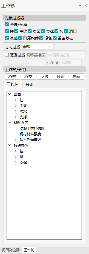 目录 搜索 展开 更新说明20251230版本更新说明更新概要1.协同模块更新点1.1通用机制1.2识图表收资⭐1.2.1操作流程介绍1.2.2功能特点1.3数据收资1.4接口1.4.1工艺协同类软件接口1.4.2计算类软件接口2.上部建模模块更新点2.1通用建模2.1.1工作树⭐2.1.2布置修改2.1.3高分屏适配⭐2.1.4楼板优化2.2快速建模⭐2.2.2快速布置水平撑2.2.1快速悬臂构件2.2.3快速洞边梁2.3智能建模2.3.1设备支架自动布梁2.4附属建模2.4.1直梯栏杆适配参数库模式2.4.2栏杆打断交互⭐3.计算模块更新点3.1荷载导荷3.2振动计算⭐3.3工况优化4.出图模块更新点4.1优化功能4.2新增海外出图模式5.基础模块更新点5.1基础模块更新点⭐5.2设备基础模块更新点5.2.1支持SH/T 3030-2025 石油化工塔型设备基础设计规范⭐5.2.2球形储罐设备及设备基础建模5.2.3支持卧式三支墩建模及计算5.2.4其他更新点1.总体介绍1.1基本功能介绍1.1.1 协同1.1.2 建模1.1.3 计算1.1.4 节点设计1.1.5 出图1.1.6 算量1.2软件界面1.2.1 菜单栏1.2.2 图形空间1.2.3 项目树1.2.4 快捷命令2.轴网2.1导入模型2.1.1导入PMCAD2.1.2增量导入PMcad2.2轴网标高2.2.1轴网标高2.2.2轴网编辑2.2.3标高编辑2.3工作面2.3.1创建工作面2.3.2工作面管理器2.3.3退出工作面2.3.4工作面的快捷按钮2.4修改工具2.4.1移动2.4.2复制2.4.3旋转2.4.4镜像2.4.5阵列2.4.6删除2.4.7拉伸2.4.8延伸2.4.9起坡2.5测量工具2.5.1测量长度2.5.2测量角度2.5.3测量面积2.5.4测量标高2.5.5测量坐标3.主构件3.1上部构件3.1.1柱3.1.2梁3.1.3支撑3.1.4快速次梁3.1.5快速支撑3.1.6拾取布置3.1.7截面刷3.2楼板3.2.1混凝土板3.2.2花纹钢板3.2.3钢格栅板3.2.4压型钢板3.2.5洞口3.2.6全房间洞3.2.7楼板设置3.2.8改板方向3.3修改3.3.1偏心对齐3.3.2构件删除3.3.3标高复制3.3.4主次梁3.3.5梁合并3.3.6梁拆分3.4基础构件3.4.1桩基3.5材料定义3.5.1全局材料3.5.2材料修改3.6显示3.6.1截面显示3.6.2构件显示3.6.3构件查找3.6.43D剖切3.6.5退出剖切4.附属构件4.1楼梯栏杆4.1.1钢直梯4.1.2钢斜梯4.1.3栏杆4.2附加构件4.2.1预埋件4.2.2地脚螺栓4.2.3翻边4.2.4钢平台4.2.5钢通道4.2.6支墩4.2.7支架4.2.8支吊架4.2.9T型支架4.2.10板式支架5.设备基础5.1收资5.1.1设备条件5.2地质资料5.2.1地质资料5.3总参5.3.1统一规定5.3.2自动生成基础规则5.4设备基础5.4.1卧式冷换设备基础5.4.2卧式容器基础5.4.3塔型设备基础5.4.4立式容器基础5.4.6管墩基础5.5设备支架5.5.1立式设备支架5.5.2卧式设备支架5.6汇总表5.6.1设备基础汇总表5.7计算6.协同6.1设备条件6.2工艺提资6.2.1荷载收资6.2.2洞口收资6.2.3埋件收资6.3智能生成6.3.1自动布梁6.4专业协同6.4.1发布设置6.4.2发布版本6.4.3参照6.5链接模型6.5.1链接P3D6.5.2链接管理7.荷载7.1荷载设置7.1.1工况管理7.1.2导荷方式7.1.3荷载显示7.2荷载布置7.2.1梁荷载7.2.2柱荷载7.2.3板均布荷载7.2.4板局部荷载7.2.5节点荷载7.3荷载快速布置7.3.1快速布置点荷载7.3.2快速布置线荷载7.3.3快速布置面荷载7.4荷载编辑7.4.1荷载修改7.4.2荷载删除7.4.3荷载清理7.4.4拾取布置7.5约束指定7.5.1支座约束7.5.2杆端约束7.5.3支座约束删除8.计算分析8.1设计层8.1.1模型检查8.1.2划分设计层8.2计算8.2.1生成分析模型8.2.2计算参数8.2.3计算8.3结果8.3.1数检定位8.3.2结果查看9.钢节点设计9.1导入结果9.1.1读取计算9.2设计方式9.3规格化节点设计9.3.1通用参数9.3.2节点配置9.3.3节点生成9.4按内力生成节点9.4.1节点参数9.4.2节点生成9.4.3节点归并9.5修改节点9.5.1节点修改9.5.2节点表修改9.6节点查询9.6.1节点设计结果9.6.2节点计算书9.6.3编号显示9.7内力查看9.8清除数据10.图纸10.1参数10.1.1 文字标准10.1.2 绘图参数10.2生成视图映射10.2.1 平面图10.2.2 立面图10.2.3 大样图10.2.4 节点图10.3填充修改10.4生成图纸10.5清单统计10.5.1 统计参数10.5.2 生成清单10.6导出图纸 暂无相关搜索结果! 2.1.1工作树⭐ 工作树筛选器新增工作树过滤器功能,主要支持光标过滤器、工作树筛选器以及构件分组功能。 【光标过滤】:支持光标过滤功能:①构件过滤功能:支持选中指定的构件类型;②方向过滤功能:支持选中X向或Y向的构件;③范围过滤功能:支持选中某个范围内的构件。 【工作树筛选】:提供工作树筛选器功能,可以快速定位到指定条件的构件,并批量完成条件修改 【构件分组】:将选择的构件记录在组中,方便再次调用。