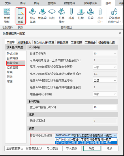 目录 搜索 展开 更新说明20251230版本更新说明更新概要1.协同模块更新点1.1通用机制1.2识图表收资⭐1.2.1操作流程介绍1.2.2功能特点1.3数据收资1.4接口1.4.1工艺协同类软件接口1.4.2计算类软件接口2.上部建模模块更新点2.1通用建模2.1.1工作树⭐2.1.2布置修改2.1.3高分屏适配⭐2.1.4楼板优化2.2快速建模⭐2.2.2快速布置水平撑2.2.1快速悬臂构件2.2.3快速洞边梁2.3智能建模2.3.1设备支架自动布梁2.4附属建模2.4.1直梯栏杆适配参数库模式2.4.2栏杆打断交互⭐3.计算模块更新点3.1荷载导荷3.2振动计算⭐3.3工况优化4.出图模块更新点4.1优化功能4.2新增海外出图模式5.基础模块更新点5.1基础模块更新点⭐5.2设备基础模块更新点5.2.1支持SH/T 3030-2025 石油化工塔型设备基础设计规范⭐5.2.2球形储罐设备及设备基础建模5.2.3支持卧式三支墩建模及计算5.2.4其他更新点1.总体介绍1.1基本功能介绍1.1.1 协同1.1.2 建模1.1.3 计算1.1.4 节点设计1.1.5 出图1.1.6 算量1.2软件界面1.2.1 菜单栏1.2.2 图形空间1.2.3 项目树1.2.4 快捷命令2.轴网2.1导入模型2.1.1导入PMCAD2.1.2增量导入PMcad2.2轴网标高2.2.1轴网标高2.2.2轴网编辑2.2.3标高编辑2.3工作面2.3.1创建工作面2.3.2工作面管理器2.3.3退出工作面2.3.4工作面的快捷按钮2.4修改工具2.4.1移动2.4.2复制2.4.3旋转2.4.4镜像2.4.5阵列2.4.6删除2.4.7拉伸2.4.8延伸2.4.9起坡2.5测量工具2.5.1测量长度2.5.2测量角度2.5.3测量面积2.5.4测量标高2.5.5测量坐标3.主构件3.1上部构件3.1.1柱3.1.2梁3.1.3支撑3.1.4快速次梁3.1.5快速支撑3.1.6拾取布置3.1.7截面刷3.2楼板3.2.1混凝土板3.2.2花纹钢板3.2.3钢格栅板3.2.4压型钢板3.2.5洞口3.2.6全房间洞3.2.7楼板设置3.2.8改板方向3.3修改3.3.1偏心对齐3.3.2构件删除3.3.3标高复制3.3.4主次梁3.3.5梁合并3.3.6梁拆分3.4基础构件3.4.1桩基3.5材料定义3.5.1全局材料3.5.2材料修改3.6显示3.6.1截面显示3.6.2构件显示3.6.3构件查找3.6.43D剖切3.6.5退出剖切4.附属构件4.1楼梯栏杆4.1.1钢直梯4.1.2钢斜梯4.1.3栏杆4.2附加构件4.2.1预埋件4.2.2地脚螺栓4.2.3翻边4.2.4钢平台4.2.5钢通道4.2.6支墩4.2.7支架4.2.8支吊架4.2.9T型支架4.2.10板式支架5.设备基础5.1收资5.1.1设备条件5.2地质资料5.2.1地质资料5.3总参5.3.1统一规定5.3.2自动生成基础规则5.4设备基础5.4.1卧式冷换设备基础5.4.2卧式容器基础5.4.3塔型设备基础5.4.4立式容器基础5.4.6管墩基础5.5设备支架5.5.1立式设备支架5.5.2卧式设备支架5.6汇总表5.6.1设备基础汇总表5.7计算6.协同6.1设备条件6.2工艺提资6.2.1荷载收资6.2.2洞口收资6.2.3埋件收资6.3智能生成6.3.1自动布梁6.4专业协同6.4.1发布设置6.4.2发布版本6.4.3参照6.5链接模型6.5.1链接P3D6.5.2链接管理7.荷载7.1荷载设置7.1.1工况管理7.1.2导荷方式7.1.3荷载显示7.2荷载布置7.2.1梁荷载7.2.2柱荷载7.2.3板均布荷载7.2.4板局部荷载7.2.5节点荷载7.3荷载快速布置7.3.1快速布置点荷载7.3.2快速布置线荷载7.3.3快速布置面荷载7.4荷载编辑7.4.1荷载修改7.4.2荷载删除7.4.3荷载清理7.4.4拾取布置7.5约束指定7.5.1支座约束7.5.2杆端约束7.5.3支座约束删除8.计算分析8.1设计层8.1.1模型检查8.1.2划分设计层8.2计算8.2.1生成分析模型8.2.2计算参数8.2.3计算8.3结果8.3.1数检定位8.3.2结果查看9.钢节点设计9.1导入结果9.1.1读取计算9.2设计方式9.3规格化节点设计9.3.1通用参数9.3.2节点配置9.3.3节点生成9.4按内力生成节点9.4.1节点参数9.4.2节点生成9.4.3节点归并9.5修改节点9.5.1节点修改9.5.2节点表修改9.6节点查询9.6.1节点设计结果9.6.2节点计算书9.6.3编号显示9.7内力查看9.8清除数据10.图纸10.1参数10.1.1 文字标准10.1.2 绘图参数10.2生成视图映射10.2.1 平面图10.2.2 立面图10.2.3 大样图10.2.4 节点图10.3填充修改10.4生成图纸10.5清单统计10.5.1 统计参数10.5.2 生成清单10.6导出图纸 暂无相关搜索结果! 5.2.1支持SH/T 3030-2025 石油化工塔型设备基础设计规范⭐ 25塔基规范参数入口 25塔基规范更新点[程序实现]基本自振周期-附录A 支持横风风振计算-条文6.3.3 风荷载扩大系数-表6.3.5 停产检修零应力区限值-条文7.2.3 圆筒式及圆柱式塔基础支墩部分的配筋需满足公式7.4.1 圆筒式筒壁构造配筋率-条文8.2.1 圆柱式圆柱构造配筋率-条文8.3.1