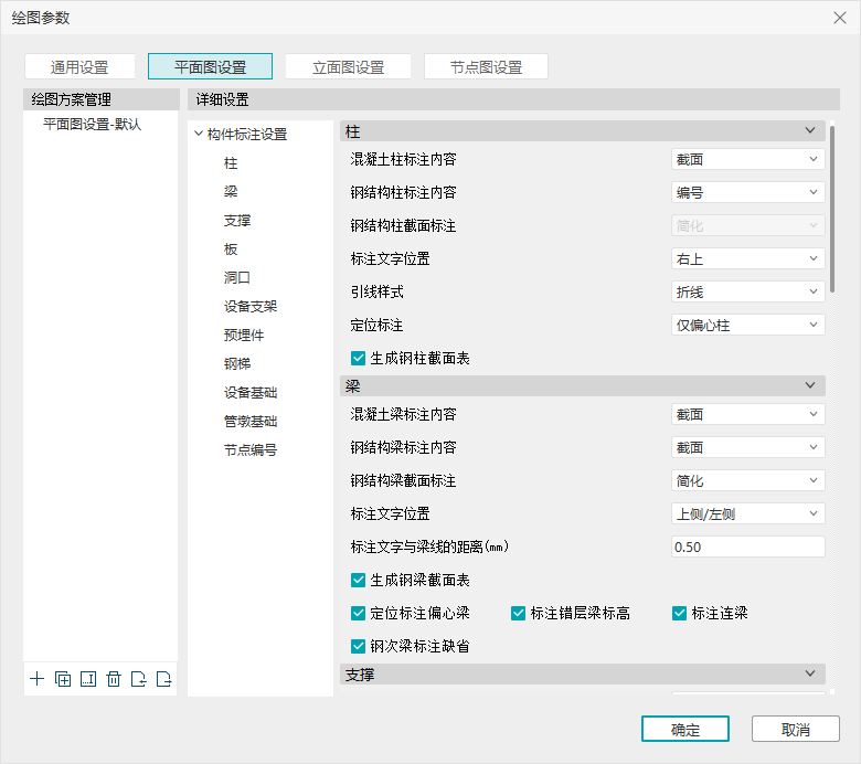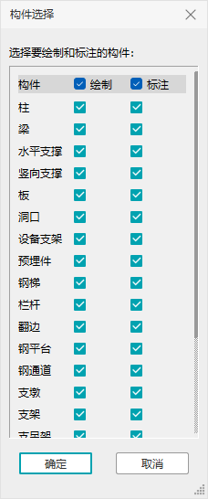 生成平面图/立面图时,不仅支持出图方案配置,且支持【绘制构件】和【标注构件】分别控制的功能。