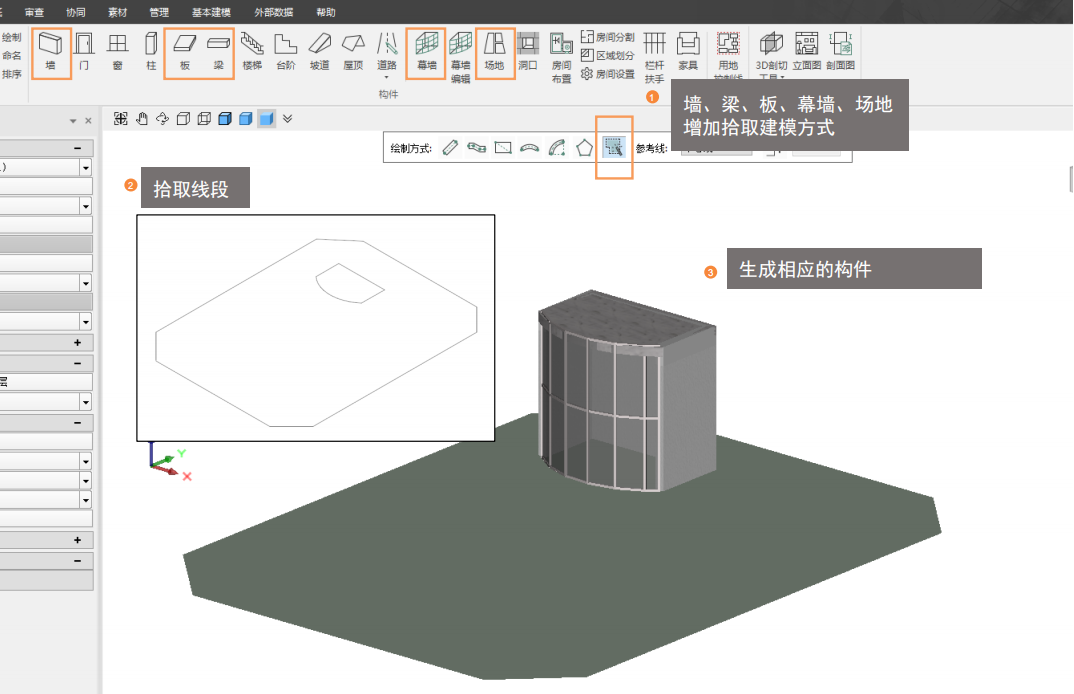 7.墙、梁、板、幕墙、场地可通过拾取生成
