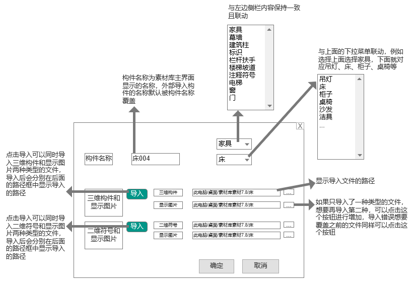 - 导入完成后,对导入构件进行命名,并选择其所属归类,方便调用,点击确定后,四个文件自动保存到对应位置,显示图片与构件名称相对应且在素材库的主界面显示出来,需要将四个文件自动放到软件中的同一个文件夹内,方便今后不同项目之间的相互拷贝。