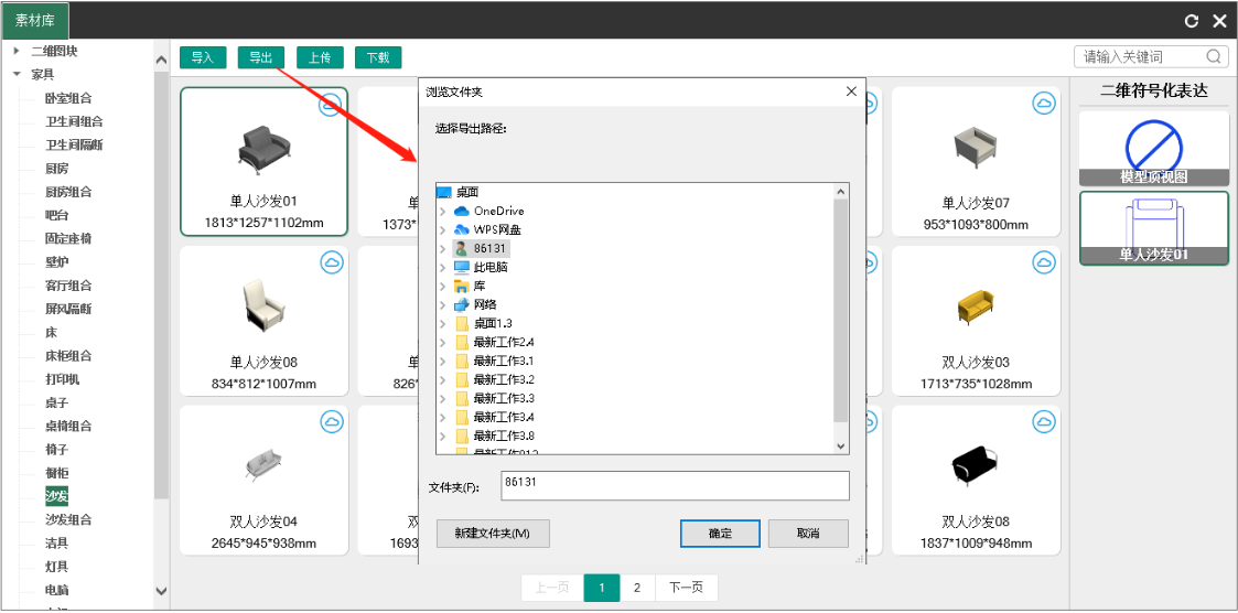 - <导出>:选中素材,点击导出,弹出浏览文件对话框,选择导出文件,用于设计师之间的传输共享。