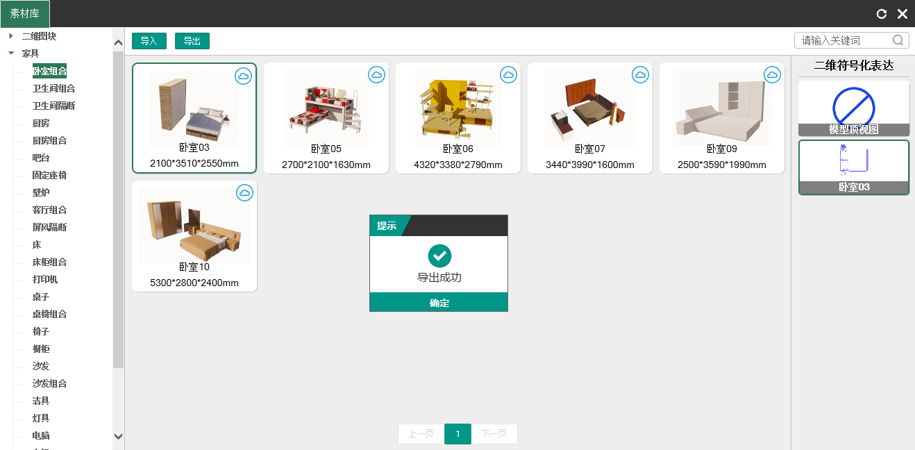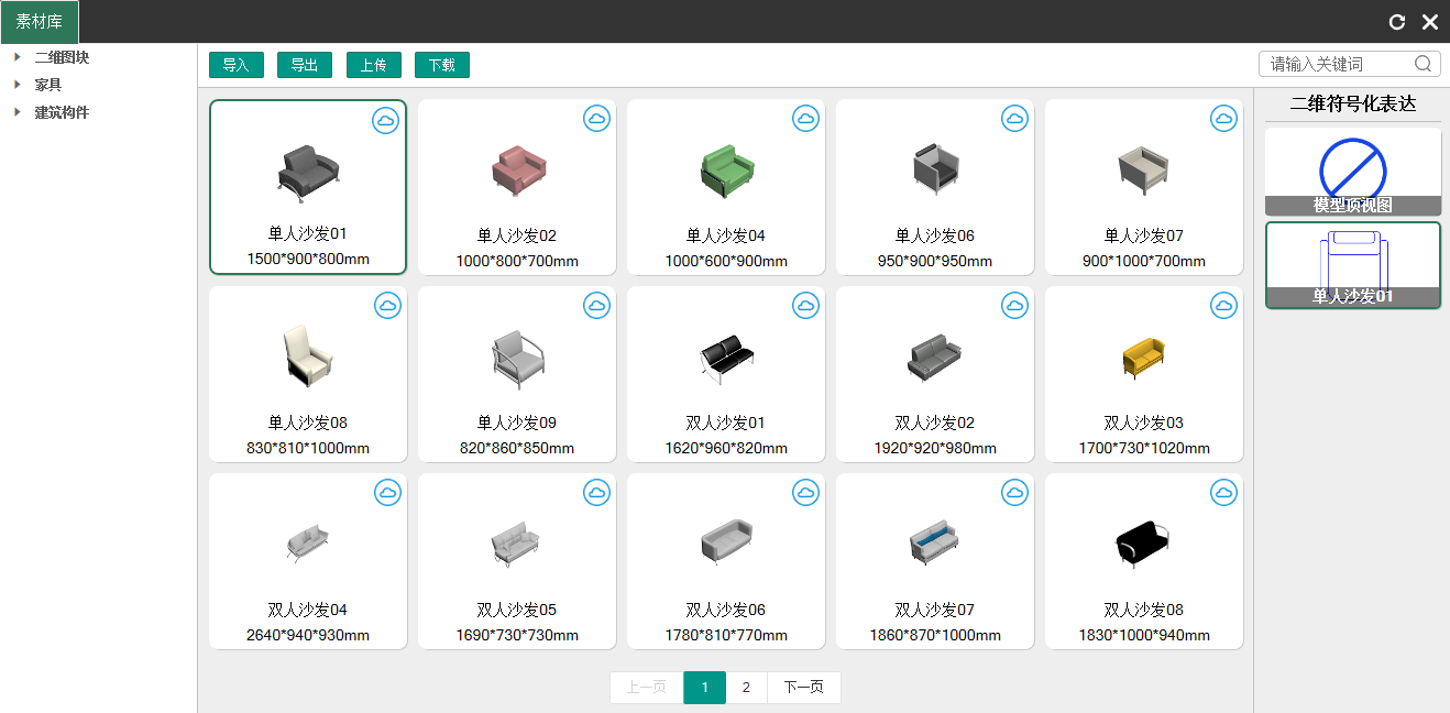 - 在主界面选择三维构件并在右边侧栏中选择需要的二维表达,点击素材左上角的放置,将选中的构件布置到模型中。