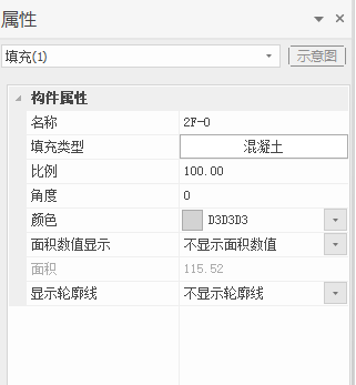 选中填充,可显示填充属性栏,修改填充名称、填充类型、填充比例、填充角度、填充颜色、控制面积数值和轮廓线显示。