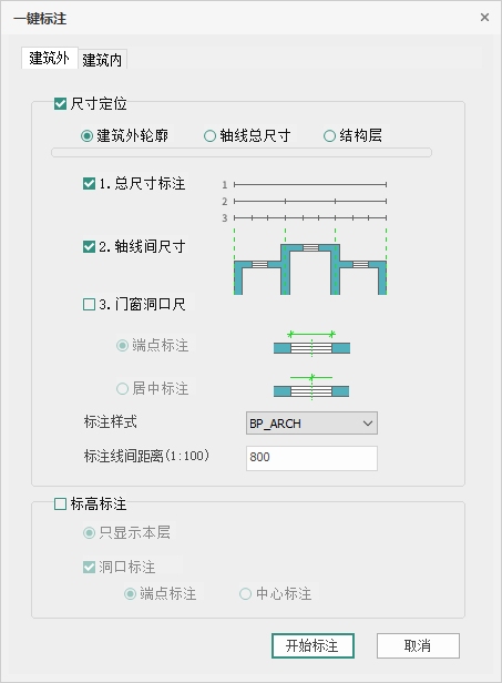 - <尺寸定位>:可选择尺寸线的定位点是【建筑外轮廓】【轴线总尺寸】【结构层】;