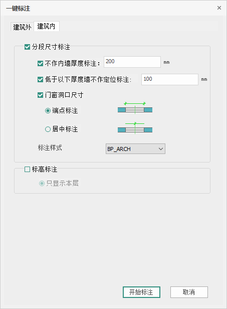 - <低于以下厚度墙不做定位标注>:勾选此项后对小于输入框中厚度的内墙不进行厚度标注;