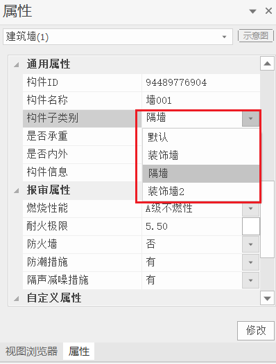 在模型创建过程中或选中布置好的构件,在构件【属性栏】-【构件子类别管理】中,下拉选择相应的子类别,此时该构件将按照子类别的相关设置进行显示。