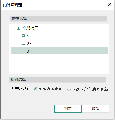 目录 搜索 展开 首页乘车路线版权与商标说明免责声明更新说明20242024R1.02024R1.12024R1.22024R1.32024R1.42024R2.02024R2.12024R2.220232023R1.020222022R3.12022R3.02022R2.12022R2.02022R1.42022R1.32022R1.22022R1.020252025R1.1工作环境最低运行环境启动界面用户操作界面快速访问工具栏视图盒子模型操作视图区命令提示行项目浏览器属性面板多窗口显示设置视图工具条光照亮度三维坐标捕捉设置通用操作文件(平台)功能键临时辅助线抬头工具栏追踪器自定义工具条临时尺寸线参考线、夹点弹出式小面板右键菜单专业建模标高标高绘制楼层管理复制构件局部复制删除构件轴网定位正交轴网轴线绘制识别联动命名排序专业构件墙创建墙编辑墙梁创建梁编辑梁板创建板编辑板柱创建柱编辑柱屋顶创建屋顶编辑屋顶幕墙创建幕墙编辑幕墙门创建门编辑门窗创建窗编辑窗自定义门窗自定义门窗预设自定义飘窗、转角窗框板编辑嵌板编辑自定义门窗的调用与管理自定义门窗导出/导入洞口创建洞口编辑洞口楼梯创建楼梯环境外编辑楼梯环境内编辑楼梯台阶创建台阶编辑台阶坡道创建坡道编辑坡道栏杆扶手创建栏杆编辑栏杆复杂截面管理器栏杆样式散水创建散水编辑散水房间布置房间配置房间分隔区域划分房间设置面层面层面层分格线场地创建场地编辑场地用地控制线创建用地控制线编辑用地控制线三维文字辅助工具识别图纸创建工作平面工作平面管理器基本建模编辑工具专业编辑工具对齐修剪延伸附着布尔剪切剪切面对齐打断端部裁剪倒角裁剪刷新偏移删除附着通用编辑移动镜像删除阵列复制旋转过滤选择过滤器增强过滤器测量长度测量角度测量面积测量标高测量坐标测量组合组合解组开始组暂停组编辑组块块定义块分解块编辑块管理拾取刷新拾取属性刷新属性计算分析计算分析内外墙判定指标分析重叠处理内外墙判定结果注释二维工具线型二维工具填充通用标注逐点标注直径标注半径标注弧长标注角度标注标高标注引出标注箭头引注索引标注多层标注折断线变更云线三维标高标注自动标注通用文字单行文字多行文字文字识别通用表格插入表格&表格编辑视图视图创建3D剖切工具局部剖切创建立面创建剖面门窗大样图纸生成图纸导出图纸清单统计清单生成清单样式清单单位清单结果审查审查流程设置全局属性楼层信息模型自检审查智能审查审查结果数据导出审查报告导出构件查找CIM平台基点设置导出广州汇交格式审查IFC深圳IFC基点设置选择标准建筑赋值空间赋值构件赋值规则配置导出SZ-IFC上海IFC选择标准基点设置楼层设置导出SH-IFC协同链接模型链接P3D链接管理碰撞检查碰撞检查碰撞结果碰撞报告净高分析净高设置净高平面净高检查净高刷新建筑开洞提资云协同合并/拆分工程合并工程批量合并拆分工程管理项目项目信息工程参数材料材料设置复合材料管理器表面材质库素材库二三维构件的导入、导出二维图块导入、导出三维图块编辑、删除二维图块编辑、删除属性修改三维构件二维构件素材修复/精度设置洁具库界面洁具的布置属性修改/更新洁具符号库组件创建bfa组件属性管理参数驱动平面工具实体工具造型工具扫掠体旋转体拉伸体融合体多界面融合截面集布尔运算交集并集差集辅助建模工作平面创建工作平面工作平面管理编辑操作说明临时坐标系组件编辑可见性材质库云端库参数化组件库(平台)类别管理类别属性管理器(平台)楼层属性楼层属性管理器裁剪裁剪方式扣减设置构件子类别构件子类别管理显示全局显示样式构件可见性方案视图覆盖方案注释样式尺寸样式文字样式快捷命令导入导出参照底图导入底图管理参照匹配导入导出导出PMODEL导入PMODEL导出IFC导入IFC导出FBX导入3ds导入SKP导入STEP对接品茗导出图片外部数据控制晨曦深化构件筛选晨曦钢筋显隐晨曦钢筋删除绿色低碳导入BDLS导出BDLS**文字示意**二级文字示意格式模板 暂无相关搜索结果! 内外墙判定 功能介绍判定内外墙体 使用说明操作步骤 点击【模型分析】下【内外墙判定】; 图1 内外墙判定工具 弹出内外墙判定对话框; 点击内外墙判定结果功能,弹出内外墙判定结果对话框。 内外墙判定 楼层选择:选择需要进行判定的楼层。 判定规则选择:选择“全部墙体更新”项,软件将对所选楼层的全部墙体进行更新判定;选择“仅对未定义墙体更新”软件将对所选楼层中内外属性为“未定义”的墙体进行更新赋值。