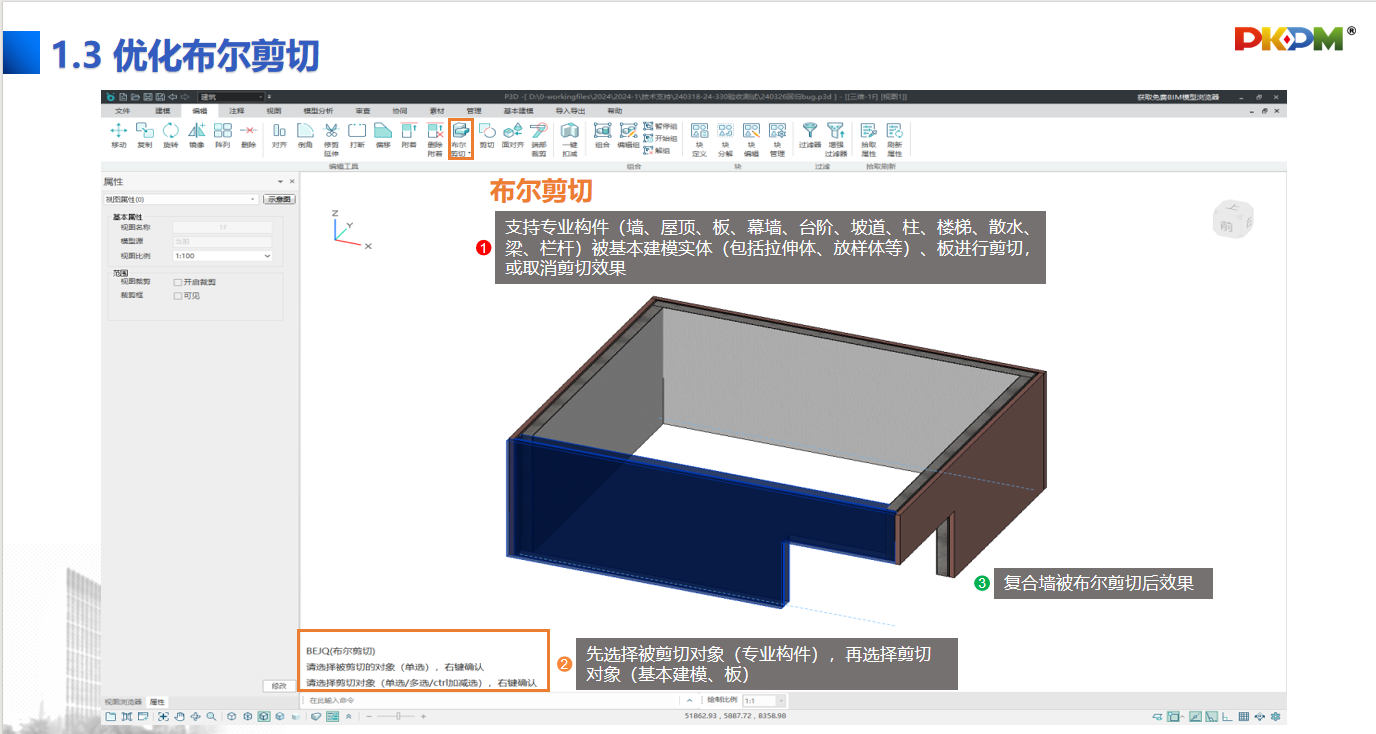 7.【布尔剪切】优化布尔剪切,支持专业构件(墙、屋顶、板、幕墙、台阶、坡道、柱、楼梯、散水、梁、栏杆)被基本建模实体(包括拉伸体、放样体等)、板进行剪切,或取消剪切效果