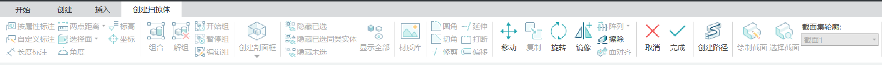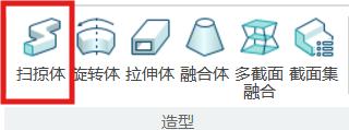 在扫掠体在位编辑环境中,分别创建扫掠路径和截面对象,单击完成按钮,即可生成扫掠体,功能位置如图1。