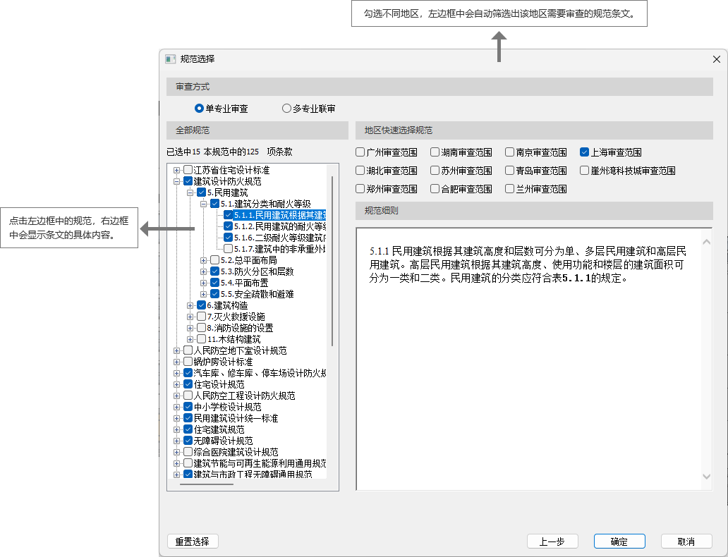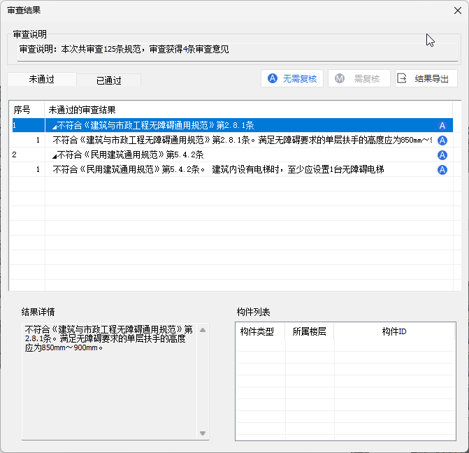 目录 搜索 展开 首页乘车路线版权与商标说明免责声明更新说明20242024R1.02024R1.12024R1.22024R1.32024R1.42024R2.02024R2.12024R2.220232023R1.020222022R3.12022R3.02022R2.12022R2.02022R1.42022R1.32022R1.22022R1.020252025R1.1工作环境最低运行环境启动界面用户操作界面快速访问工具栏视图盒子模型操作视图区命令提示行项目浏览器属性面板多窗口显示设置视图工具条光照亮度三维坐标捕捉设置通用操作文件(平台)功能键临时辅助线抬头工具栏追踪器自定义工具条临时尺寸线参考线、夹点弹出式小面板右键菜单专业建模标高标高绘制楼层管理复制构件局部复制删除构件轴网定位正交轴网轴线绘制识别联动命名排序专业构件墙创建墙编辑墙梁创建梁编辑梁板创建板编辑板柱创建柱编辑柱屋顶创建屋顶编辑屋顶幕墙创建幕墙编辑幕墙门创建门编辑门窗创建窗编辑窗自定义门窗自定义门窗预设自定义飘窗、转角窗框板编辑嵌板编辑自定义门窗的调用与管理自定义门窗导出/导入洞口创建洞口编辑洞口楼梯创建楼梯环境外编辑楼梯环境内编辑楼梯台阶创建台阶编辑台阶坡道创建坡道编辑坡道栏杆扶手创建栏杆编辑栏杆复杂截面管理器栏杆样式散水创建散水编辑散水房间布置房间配置房间分隔区域划分房间设置面层面层面层分格线场地创建场地编辑场地用地控制线创建用地控制线编辑用地控制线三维文字辅助工具识别图纸创建工作平面工作平面管理器基本建模编辑工具专业编辑工具对齐修剪延伸附着布尔剪切剪切面对齐打断端部裁剪倒角裁剪刷新偏移删除附着通用编辑移动镜像删除阵列复制旋转过滤选择过滤器增强过滤器测量长度测量角度测量面积测量标高测量坐标测量组合组合解组开始组暂停组编辑组块块定义块分解块编辑块管理拾取刷新拾取属性刷新属性计算分析计算分析内外墙判定指标分析重叠处理内外墙判定结果注释二维工具线型二维工具填充通用标注逐点标注直径标注半径标注弧长标注角度标注标高标注引出标注箭头引注索引标注多层标注折断线变更云线三维标高标注自动标注通用文字单行文字多行文字文字识别通用表格插入表格&表格编辑视图视图创建3D剖切工具局部剖切创建立面创建剖面门窗大样图纸生成图纸导出图纸清单统计清单生成清单样式清单单位清单结果审查审查流程设置全局属性楼层信息模型自检审查智能审查审查结果数据导出审查报告导出构件查找CIM平台基点设置导出广州汇交格式审查IFC深圳IFC基点设置选择标准建筑赋值空间赋值构件赋值规则配置导出SZ-IFC上海IFC选择标准基点设置楼层设置导出SH-IFC协同链接模型链接P3D链接管理碰撞检查碰撞检查碰撞结果碰撞报告净高分析净高设置净高平面净高检查净高刷新建筑开洞提资云协同合并/拆分工程合并工程批量合并拆分工程管理项目项目信息工程参数材料材料设置复合材料管理器表面材质库素材库二三维构件的导入、导出二维图块导入、导出三维图块编辑、删除二维图块编辑、删除属性修改三维构件二维构件素材修复/精度设置洁具库界面洁具的布置属性修改/更新洁具符号库组件创建bfa组件属性管理参数驱动平面工具实体工具造型工具扫掠体旋转体拉伸体融合体多界面融合截面集布尔运算交集并集差集辅助建模工作平面创建工作平面工作平面管理编辑操作说明临时坐标系组件编辑可见性材质库云端库参数化组件库(平台)类别管理类别属性管理器(平台)楼层属性楼层属性管理器裁剪裁剪方式扣减设置构件子类别构件子类别管理显示全局显示样式构件可见性方案视图覆盖方案注释样式尺寸样式文字样式快捷命令导入导出参照底图导入底图管理参照匹配导入导出导出PMODEL导入PMODEL导出IFC导入IFC导出FBX导入3ds导入SKP导入STEP对接品茗导出图片外部数据控制晨曦深化构件筛选晨曦钢筋显隐晨曦钢筋删除绿色低碳导入BDLS导出BDLS**文字示意**二级文字示意格式模板 暂无相关搜索结果! 智能审查 功能介绍 点击智能审查先跳转到全局属性界面,点击确定跳转到条文选择界面,如下图所示。 图1 规范选择 点击确定后等待在软件自动进行审查并自动跳转生成审查结果,如下图所示。 图2 审查结果