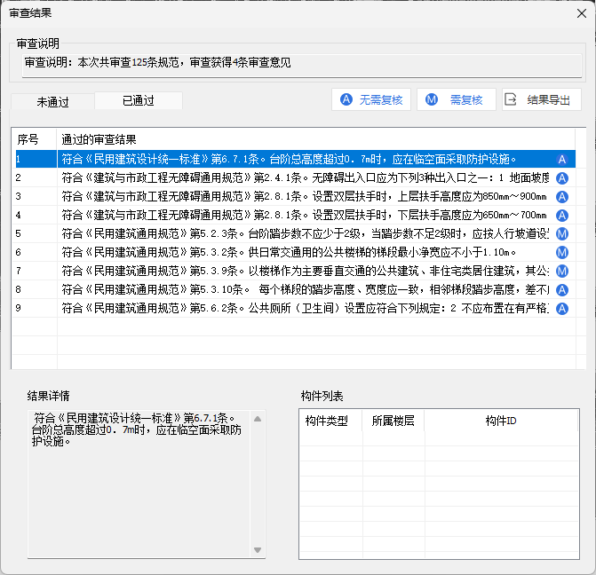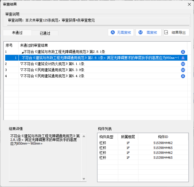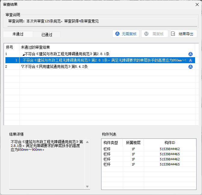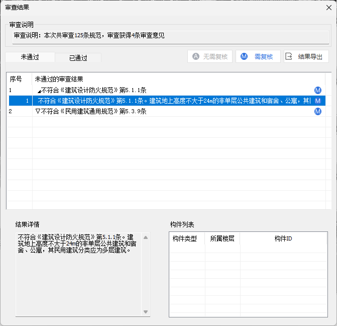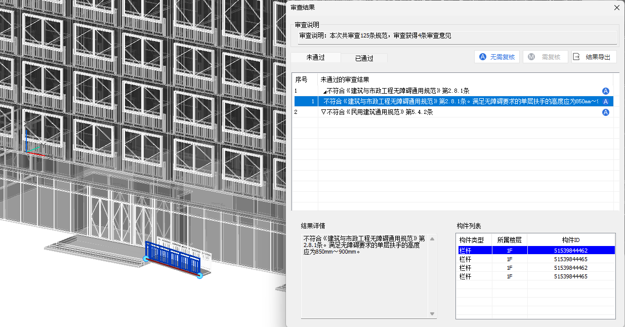 在【未通过】的审查结果中,任意选中一条条文,在“构件列表”中双击构件ID,则软件自动在模型中高亮定位有问题的构件,方便问题查找及修改,如下图5所示。