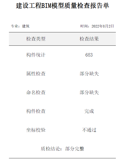 目录 搜索 展开 首页乘车路线版权与商标说明免责声明更新说明20242024R1.02024R1.12024R1.22024R1.32024R1.42024R2.02024R2.12024R2.220232023R1.020222022R3.12022R3.02022R2.12022R2.02022R1.42022R1.32022R1.22022R1.020252025R1.1工作环境最低运行环境启动界面用户操作界面快速访问工具栏视图盒子模型操作视图区命令提示行项目浏览器属性面板多窗口显示设置视图工具条光照亮度三维坐标捕捉设置通用操作文件(平台)功能键临时辅助线抬头工具栏追踪器自定义工具条临时尺寸线参考线、夹点弹出式小面板右键菜单专业建模标高标高绘制楼层管理复制构件局部复制删除构件轴网定位正交轴网轴线绘制识别联动命名排序专业构件墙创建墙编辑墙梁创建梁编辑梁板创建板编辑板柱创建柱编辑柱屋顶创建屋顶编辑屋顶幕墙创建幕墙编辑幕墙门创建门编辑门窗创建窗编辑窗自定义门窗自定义门窗预设自定义飘窗、转角窗框板编辑嵌板编辑自定义门窗的调用与管理自定义门窗导出/导入洞口创建洞口编辑洞口楼梯创建楼梯环境外编辑楼梯环境内编辑楼梯台阶创建台阶编辑台阶坡道创建坡道编辑坡道栏杆扶手创建栏杆编辑栏杆复杂截面管理器栏杆样式散水创建散水编辑散水房间布置房间配置房间分隔区域划分房间设置面层面层面层分格线场地创建场地编辑场地用地控制线创建用地控制线编辑用地控制线三维文字辅助工具识别图纸创建工作平面工作平面管理器基本建模编辑工具专业编辑工具对齐修剪延伸附着布尔剪切剪切面对齐打断端部裁剪倒角裁剪刷新偏移删除附着通用编辑移动镜像删除阵列复制旋转过滤选择过滤器增强过滤器测量长度测量角度测量面积测量标高测量坐标测量组合组合解组开始组暂停组编辑组块块定义块分解块编辑块管理拾取刷新拾取属性刷新属性计算分析计算分析内外墙判定指标分析重叠处理内外墙判定结果注释二维工具线型二维工具填充通用标注逐点标注直径标注半径标注弧长标注角度标注标高标注引出标注箭头引注索引标注多层标注折断线变更云线三维标高标注自动标注通用文字单行文字多行文字文字识别通用表格插入表格&表格编辑视图视图创建3D剖切工具局部剖切创建立面创建剖面门窗大样图纸生成图纸导出图纸清单统计清单生成清单样式清单单位清单结果审查审查流程设置全局属性楼层信息模型自检审查智能审查审查结果数据导出审查报告导出构件查找CIM平台基点设置导出广州汇交格式审查IFC深圳IFC基点设置选择标准建筑赋值空间赋值构件赋值规则配置导出SZ-IFC上海IFC选择标准基点设置楼层设置导出SH-IFC协同链接模型链接P3D链接管理碰撞检查碰撞检查碰撞结果碰撞报告净高分析净高设置净高平面净高检查净高刷新建筑开洞提资云协同合并/拆分工程合并工程批量合并拆分工程管理项目项目信息工程参数材料材料设置复合材料管理器表面材质库素材库二三维构件的导入、导出二维图块导入、导出三维图块编辑、删除二维图块编辑、删除属性修改三维构件二维构件素材修复/精度设置洁具库界面洁具的布置属性修改/更新洁具符号库组件创建bfa组件属性管理参数驱动平面工具实体工具造型工具扫掠体旋转体拉伸体融合体多界面融合截面集布尔运算交集并集差集辅助建模工作平面创建工作平面工作平面管理编辑操作说明临时坐标系组件编辑可见性材质库云端库参数化组件库(平台)类别管理类别属性管理器(平台)楼层属性楼层属性管理器裁剪裁剪方式扣减设置构件子类别构件子类别管理显示全局显示样式构件可见性方案视图覆盖方案注释样式尺寸样式文字样式快捷命令导入导出参照底图导入底图管理参照匹配导入导出导出PMODEL导入PMODEL导出IFC导入IFC导出FBX导入3ds导入SKP导入STEP对接品茗导出图片外部数据控制晨曦深化构件筛选晨曦钢筋显隐晨曦钢筋删除绿色低碳导入BDLS导出BDLS**文字示意**二级文字示意格式模板 暂无相关搜索结果! 审查报告导出 功能介绍导出符合各地要求的质检报告(图2)。 图1 导出质检报告 图2 质检报告