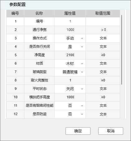- <参数配置>对话框以表格的形式呈现,表头栏由“编号”、“名称”、“属性值”、“取值范围”4个部分组成;