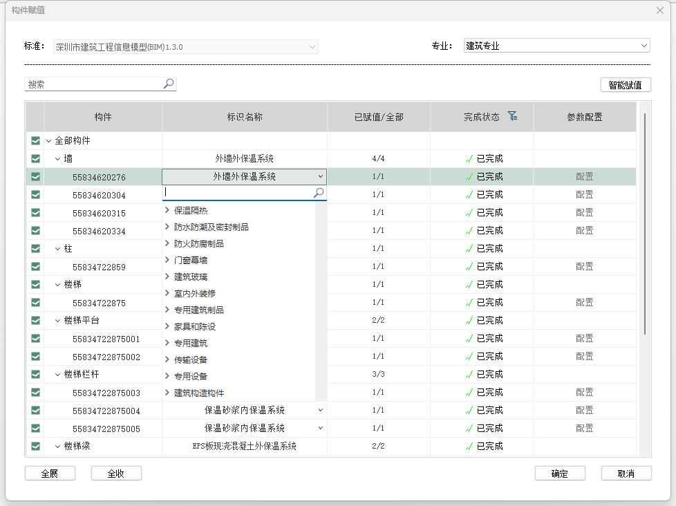 赋值结果以表格的形式呈现,表头栏由“构件”、“标识名称”、“已赋值/全部”、“完成状态”、“参数配置”5个部分组成,表格的最左端设有点选框。
