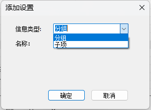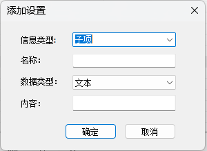 - <添加>:选中项目信息对话框中的任意分组或者子项,再点击添加,可对应新增分组或者子项;信息类型可以修改下拉选项为添加分组或子项;添加子项时,可根据需要修改数据类型为文本或者枚举;名称为添加分组或子项的名称;子项内容为子项的默认值;