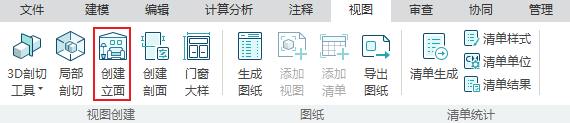 在【视图】中,点击【创建立面】(见图1),可使用【矩形创建】或【直线创建】两种方式创建立面图(见图2);