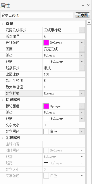 布置变更云线后左键单击选中标注,可在属性栏中修改标注的属性,如图3