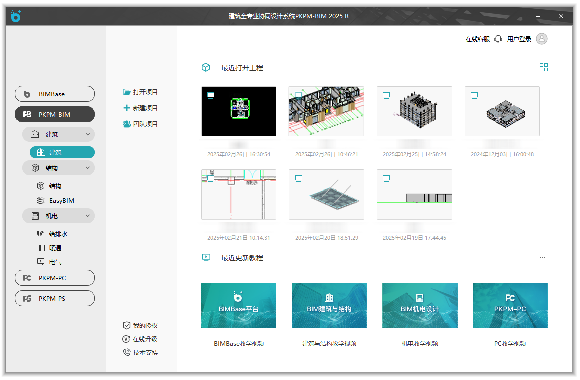 该界面是启动软件之后最先看到的界面,支持新建项目或打开现有项目。该界面左侧提供基于BIMBase平台的多款软件。展开PKPM-BIM后,可见“建筑”、“结构”、“机电”功能模块及其相关子部分,便于快速访问所需工具。