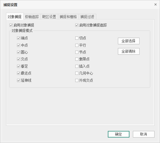 在该【对象捕捉】选项中,可以设置是否启用对象捕捉、对象捕捉追踪,并对对象捕捉模式进行选择;