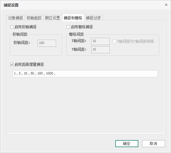 选择【捕捉和栅格】选项卡,界面如图所示,勾选“启用极轴捕捉”,可以在极轴间距文本框中输入数值,勾选“启用栅格捕捉”,可以在栅格间距的文本框中分别输入X、Y轴间距数值;