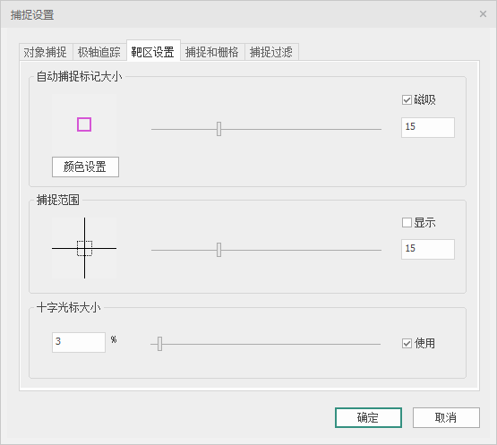 选择【靶区设置】选项卡,界面如图所示,可以对自动捕捉标记大小、靶框大小和十字光标大小进行设置;