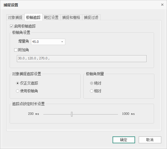 选择【极轴追踪】选项卡,界面如图所示,勾选“启用极轴追踪”,可以在增量角下拉菜单中输入角度,也可以通过下拉菜单选择常用角度;勾选“附加角”,可以对角度进行新建和删除;勾选“延伸捕捉”,可以选择“仅正交追踪”和“使用所有角设置”;