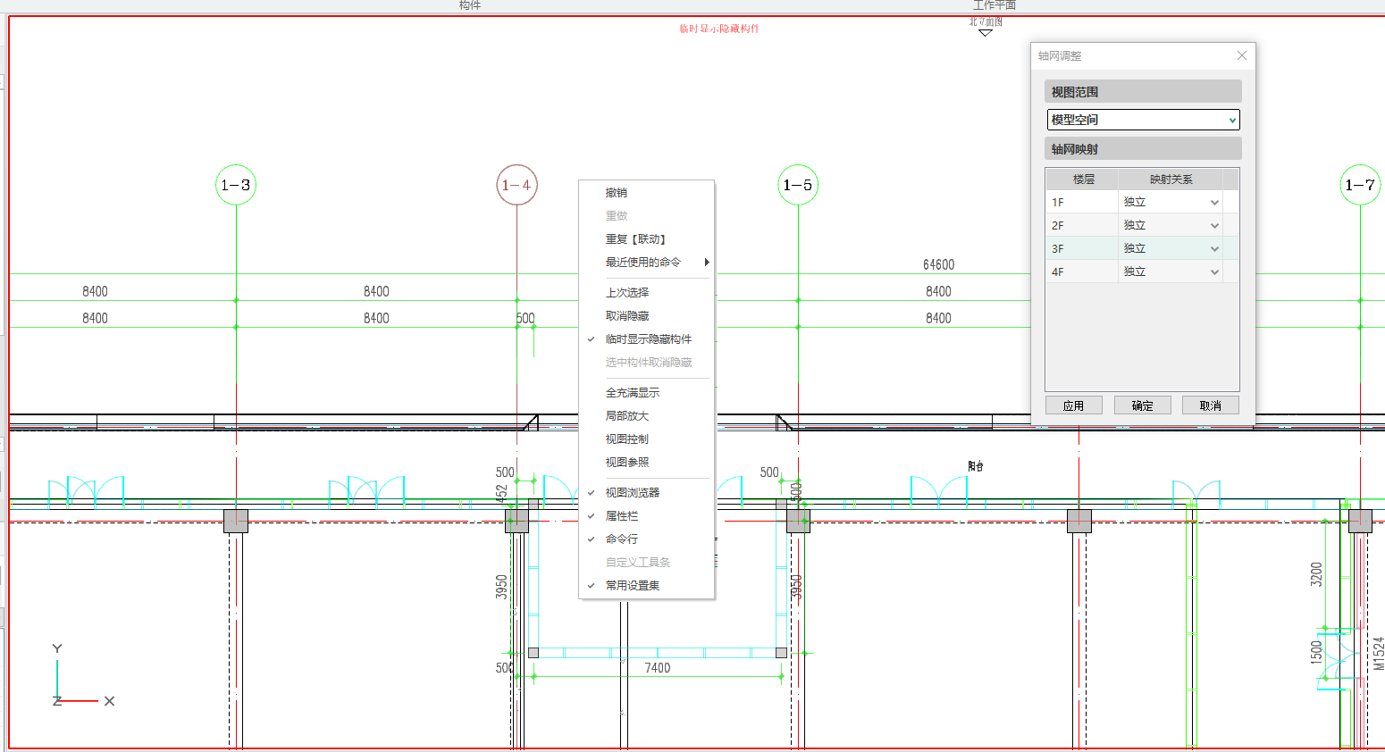 此时修改独立层的轴网的轴线长短以及显隐关系,有相关联动关系的视图中的轴线显示需要跟随联动关系,不可以单独调整独立层相联动的层的轴线