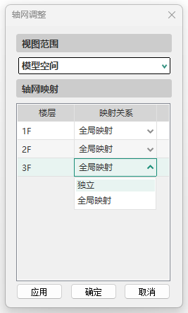 <全局映射>:全局映射模式下,轴网的调整会跨楼层生效,即修改一个轴网时,所有与之关联的轴网都会同步更新。