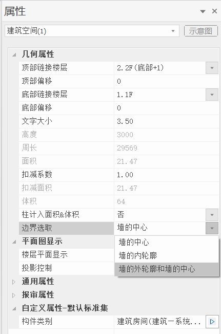 - <边界选取>:可调整房间边界的选取方式,分别为按<墙的中心><墙的内轮廓><墙的外轮廓和中心>
