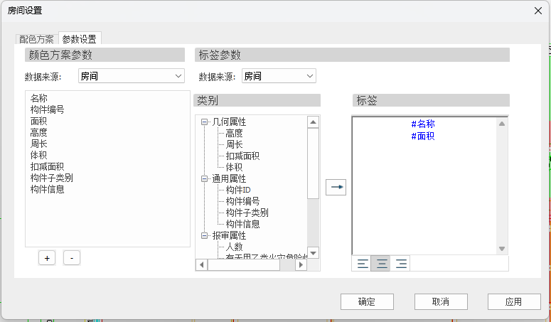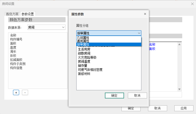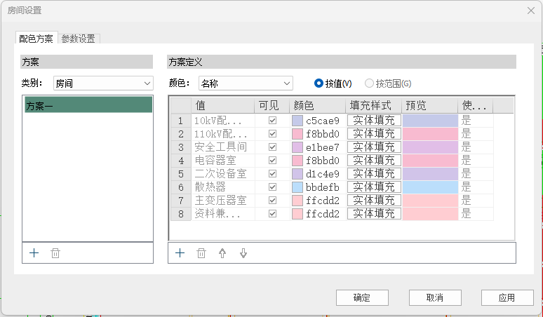 点击<数据来源>选择<房间>或<区域>,可对房间或区域的颜色方案参数进行调整